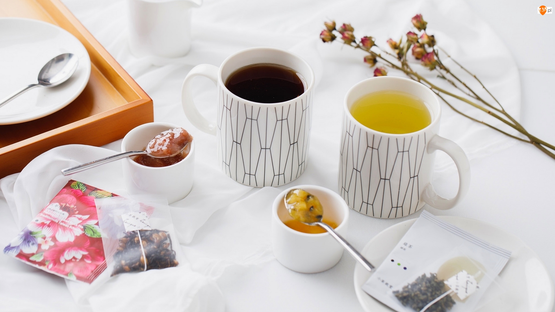 Dwa, Kubki, Talerz, Herbata, Taca, Kwiaty, Konfitury