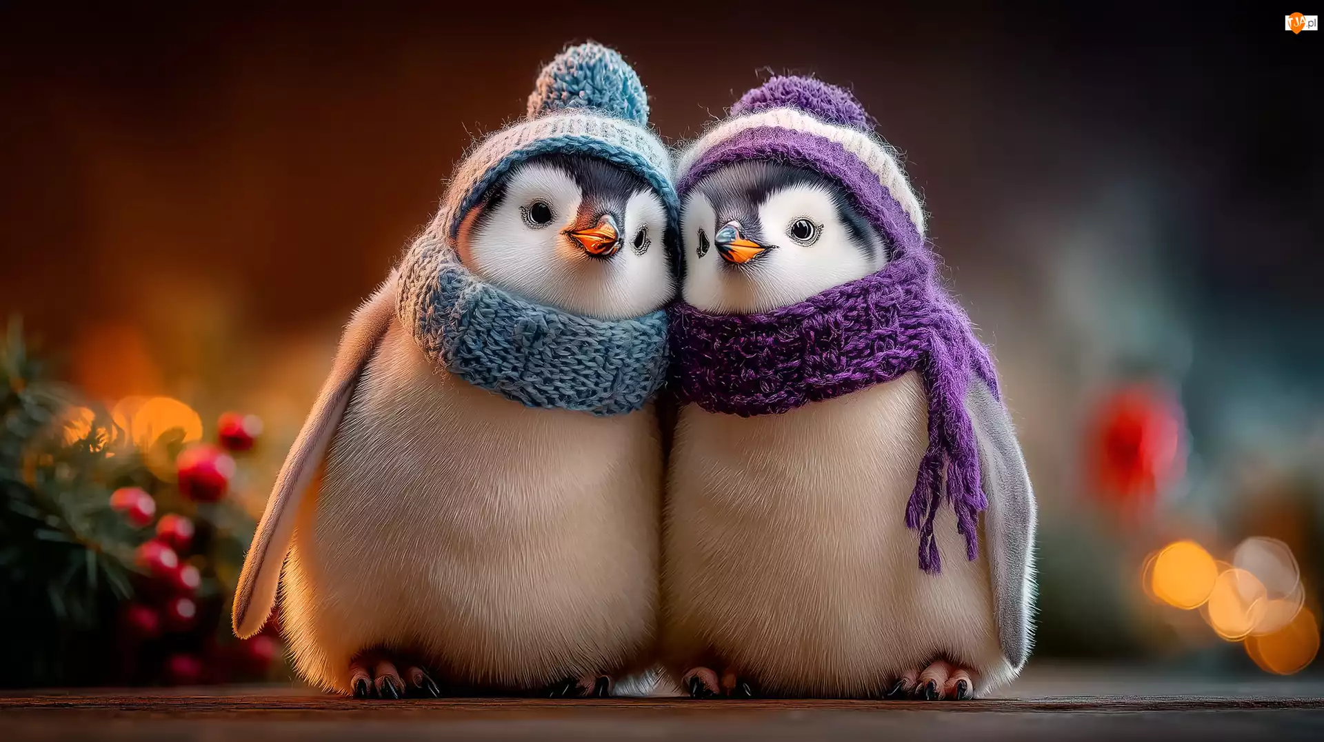 Dwa przytulone pingwiny w kolorowych czapkach i sz