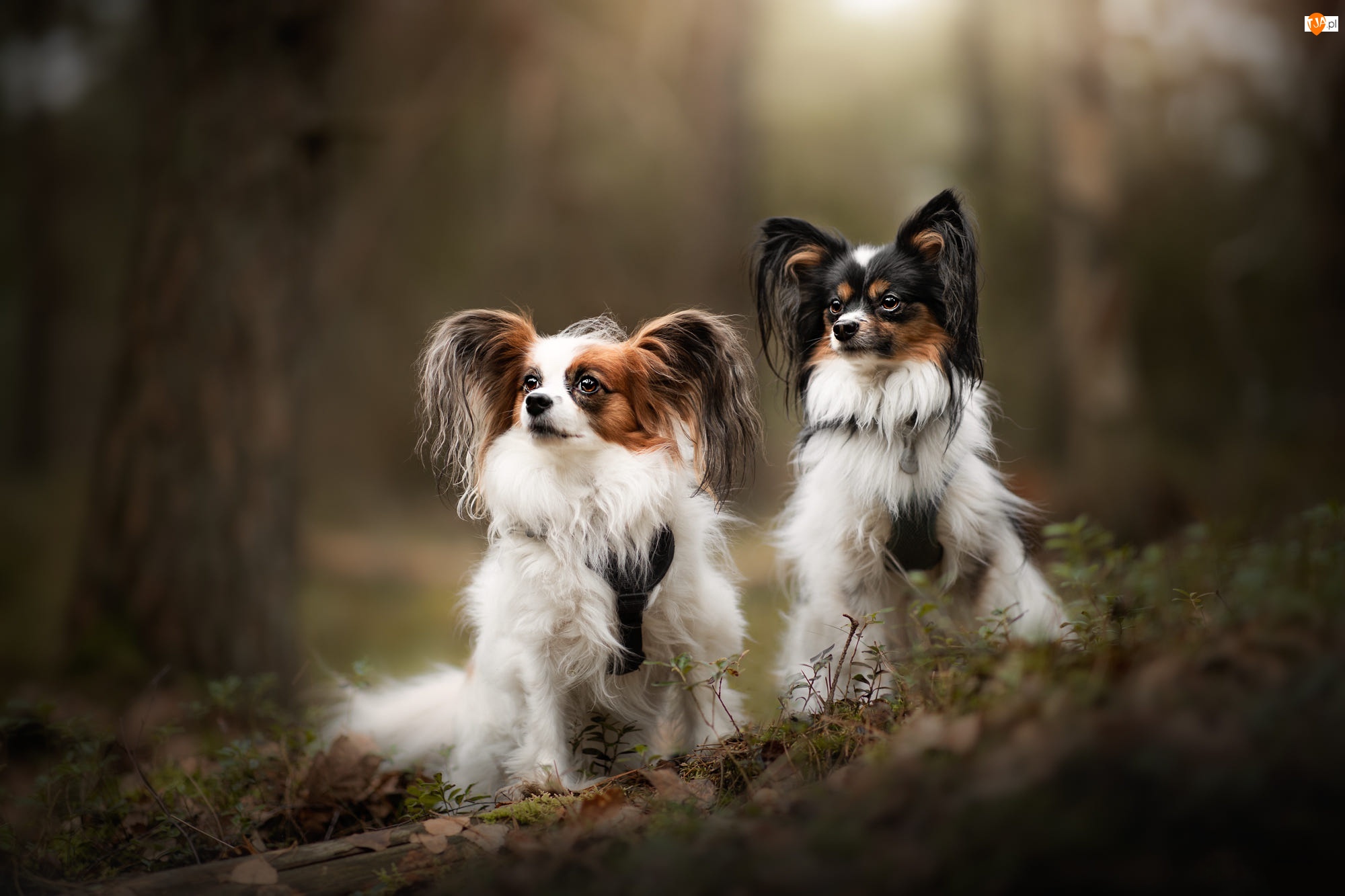 Dwa, Spaniele kontynentalne miniaturowe Papillon, Drzewa, Las, Psy