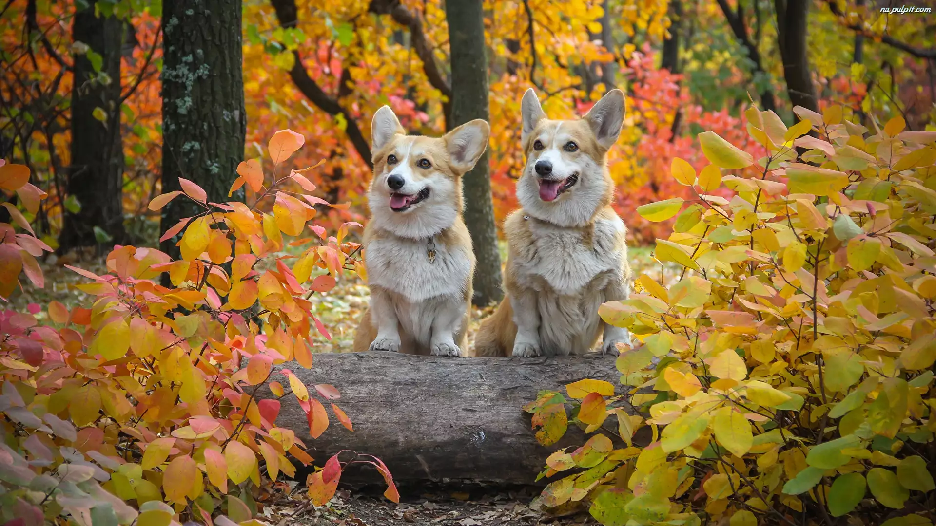 Psy, Dwa, Las, Jesień, Welsh corgi pembroke, Liście