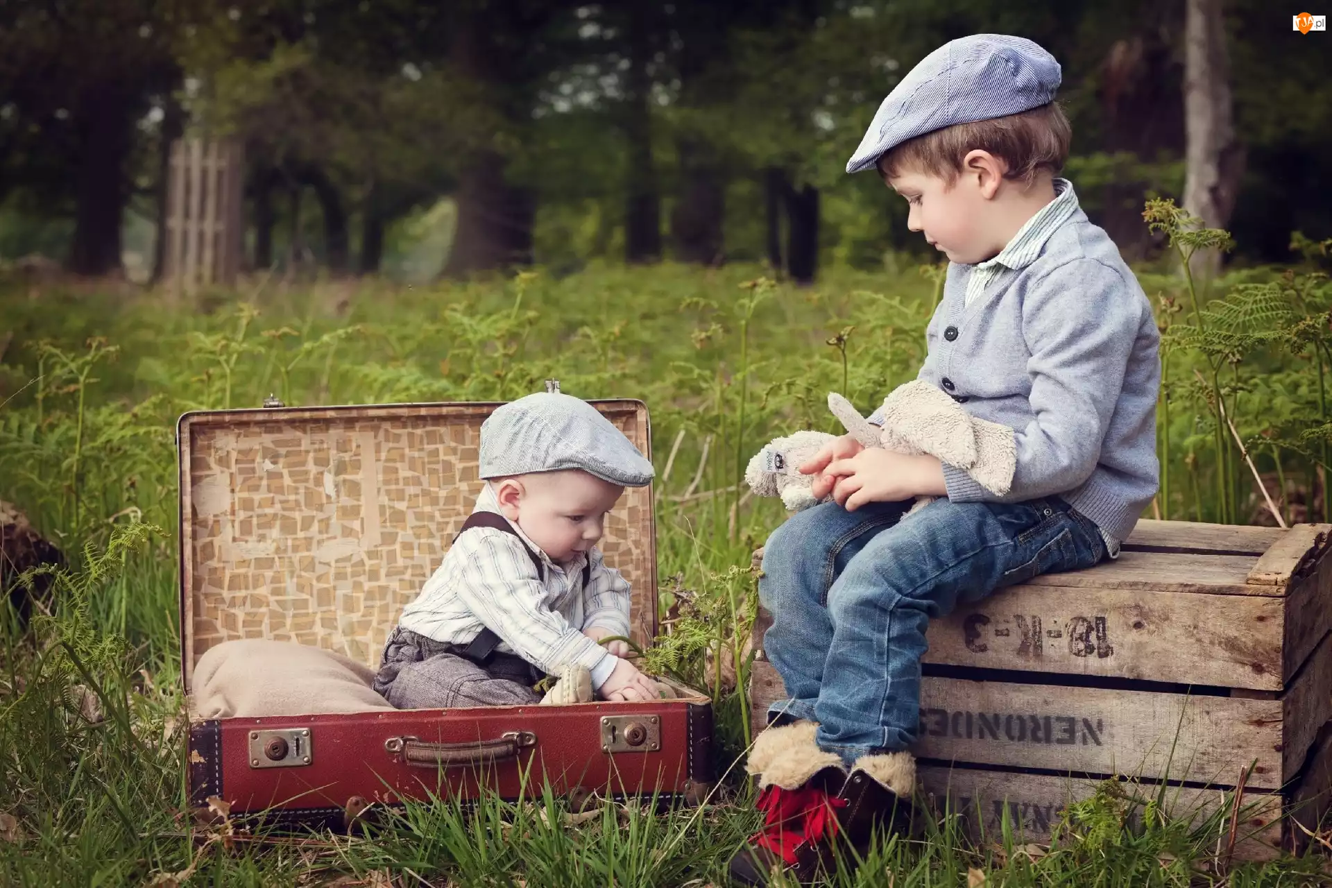Dwaj, Łąka, Chłopcy, Walizka