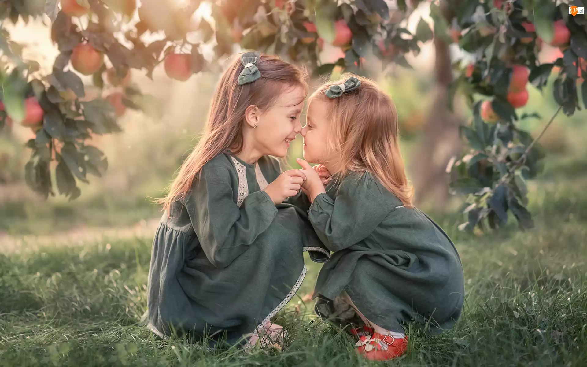 Zielone, Sukienki, Trawa, Dziewczynki, Jabłka, Drzewa, Sad