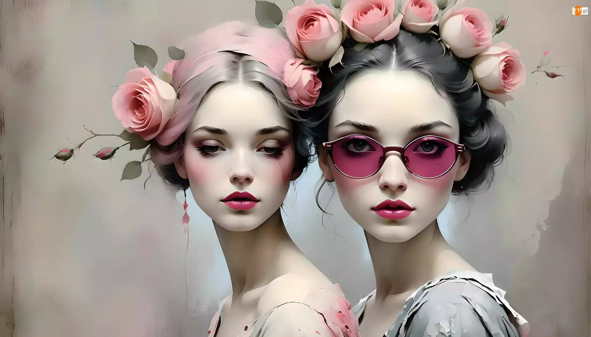 Kwiaty, Grafika, Dziewczyny, Dwie, Okulary