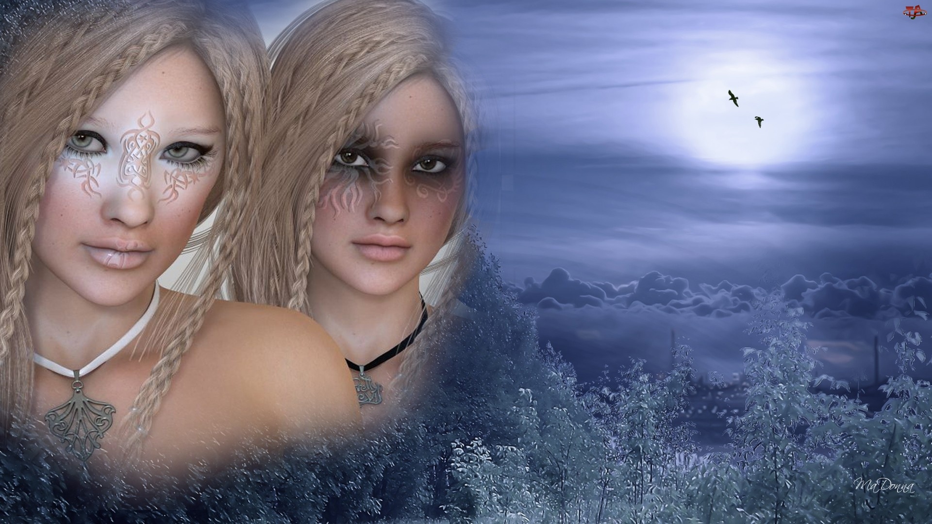 Dwie, Księżyc, Kobiety, Drzewa