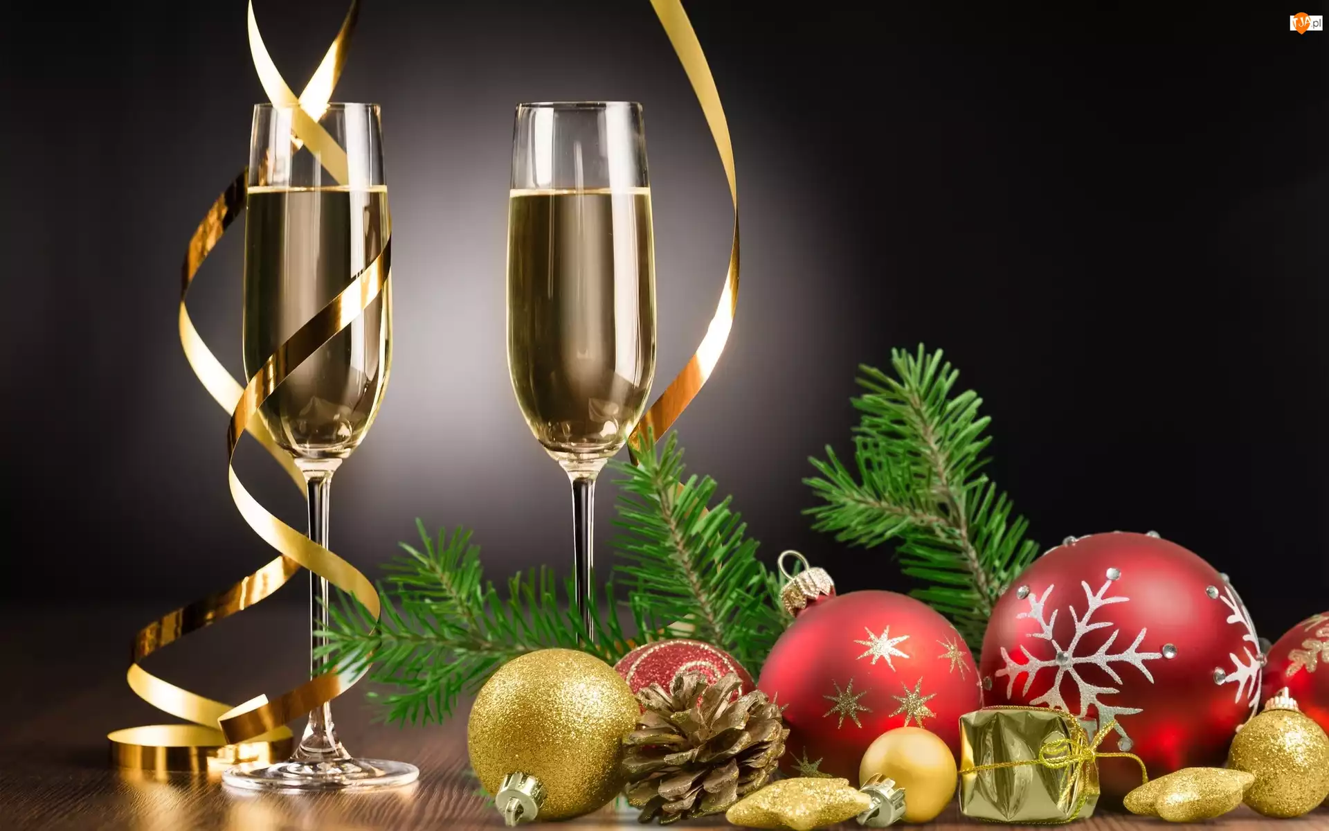 Dwa, Kieliszki, Świąteczna, Gałązki, Kompozycja, Bombki, Sylwester, Szampan