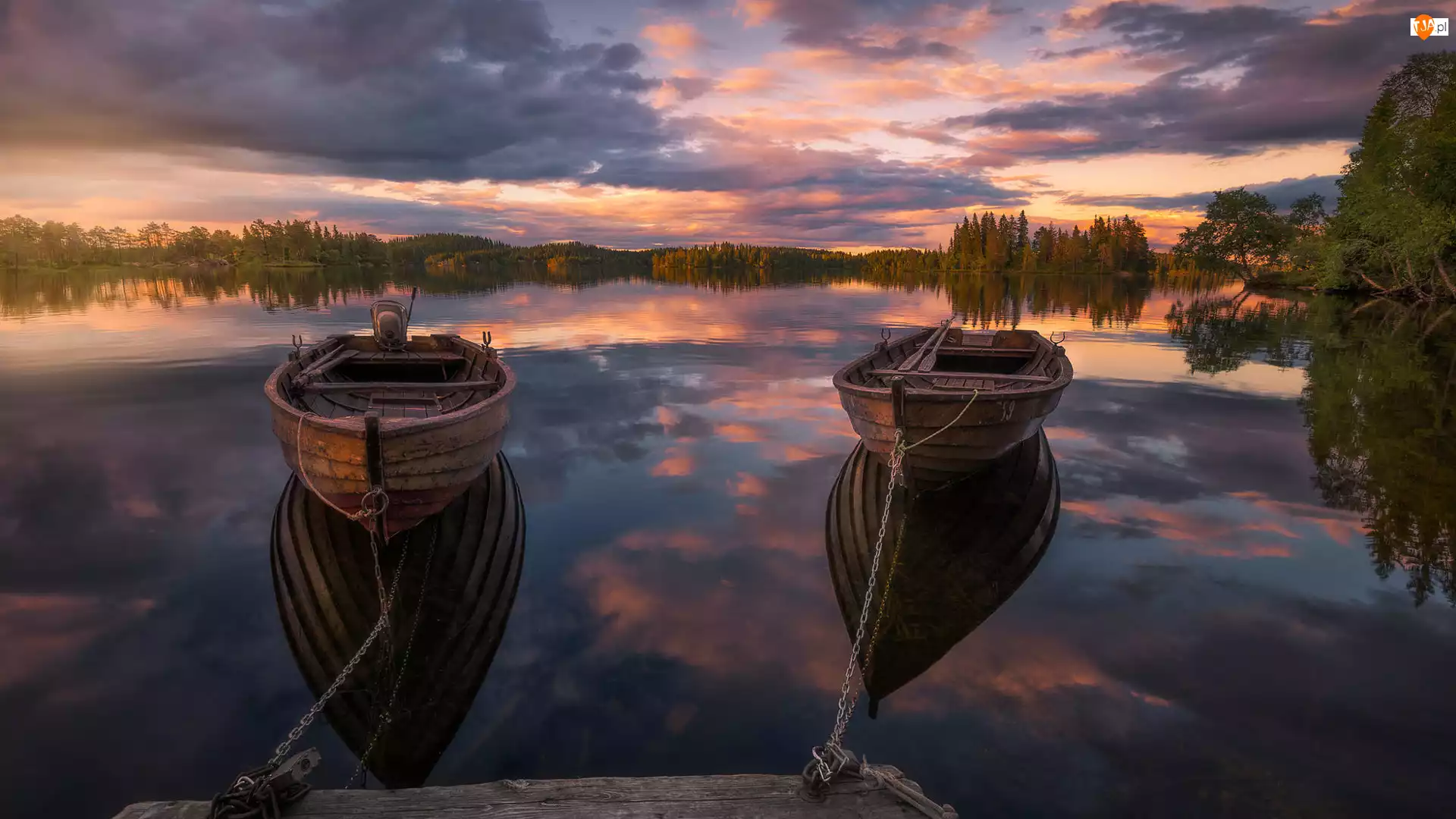 Ringerike, Jezioro, Chmury, Norwegia, Łódki, Pomost, Drzewa
