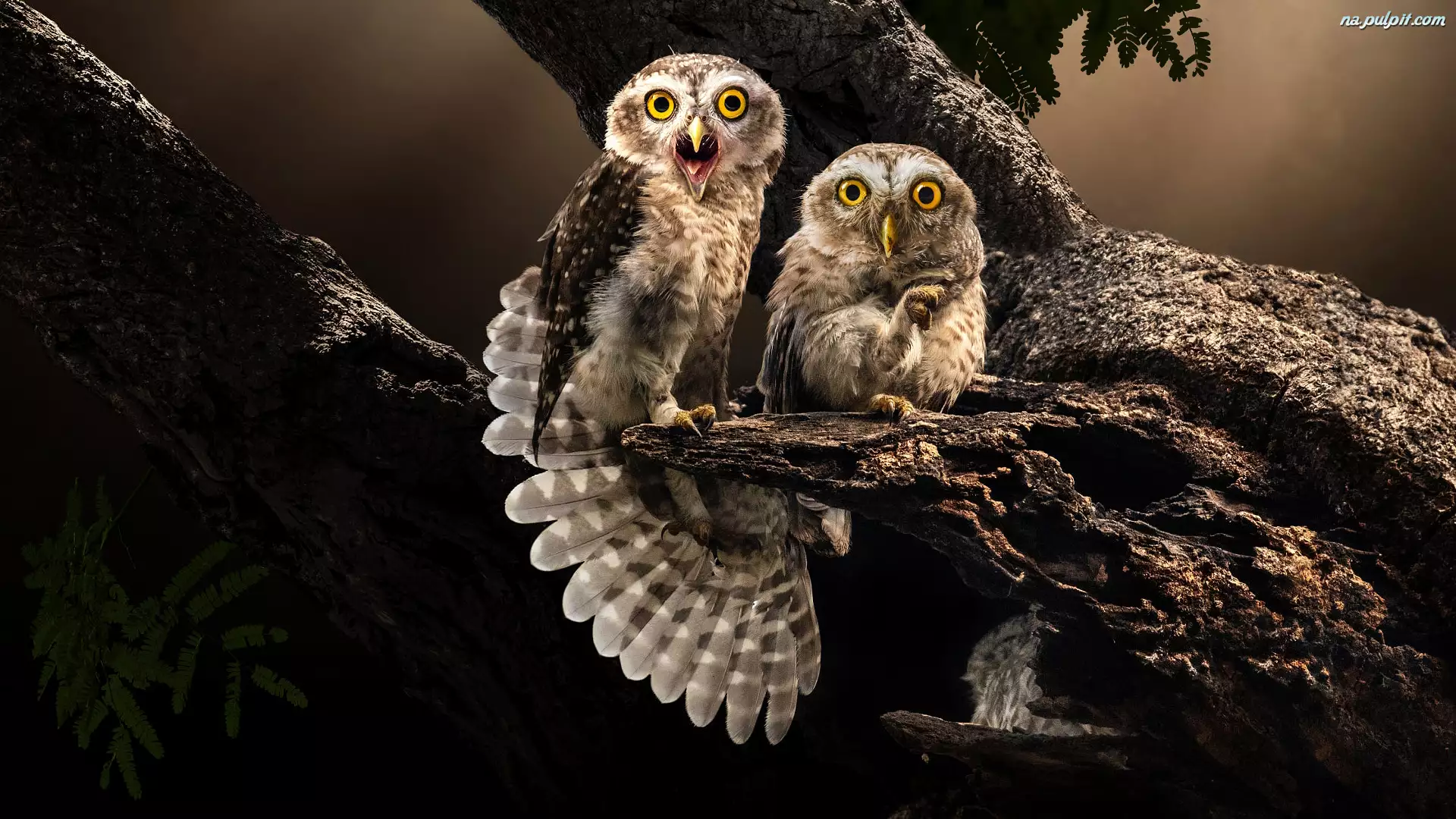 Dwie, Pójdźki bramińskie, Konar, Drzewo, Sowy