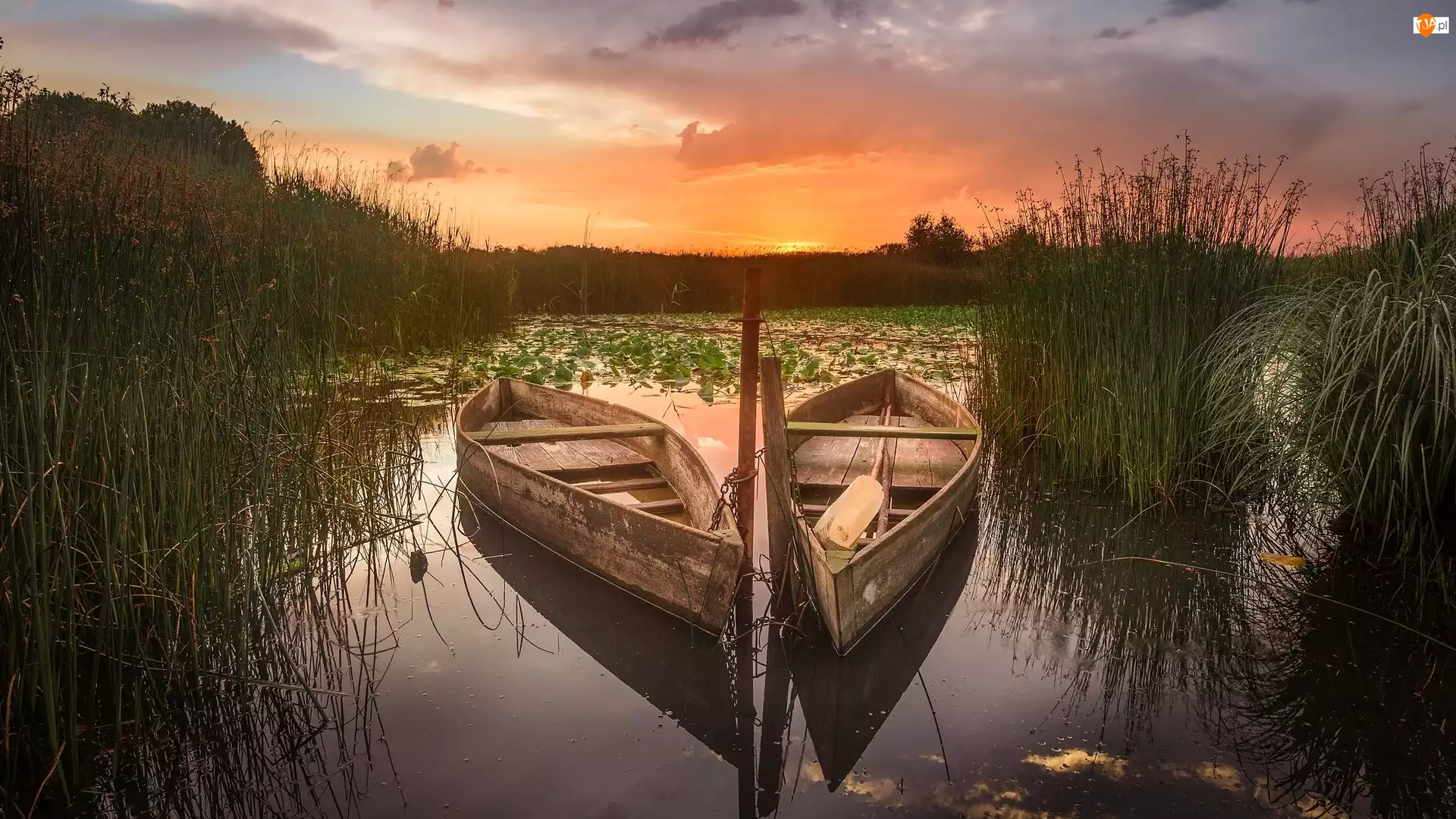 Dwie, Trzciny, Jezioro, Zachód słońca, Łódki