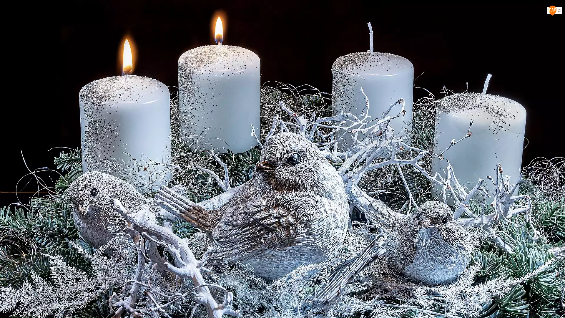 Czarne tło, Cztery, Ptaszki, Gałązki, Jodła, Białe, Świece, Adwent, Stroik