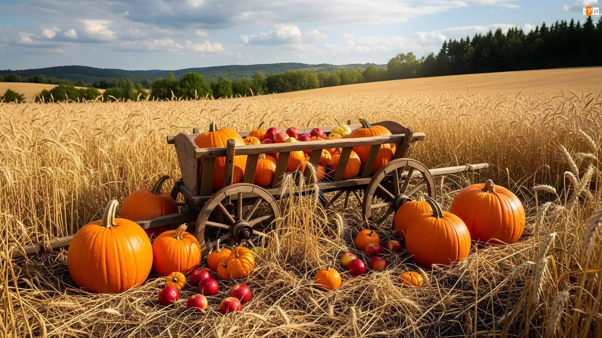 Wóz, Zboże, Jabłka, Dynie, Pole