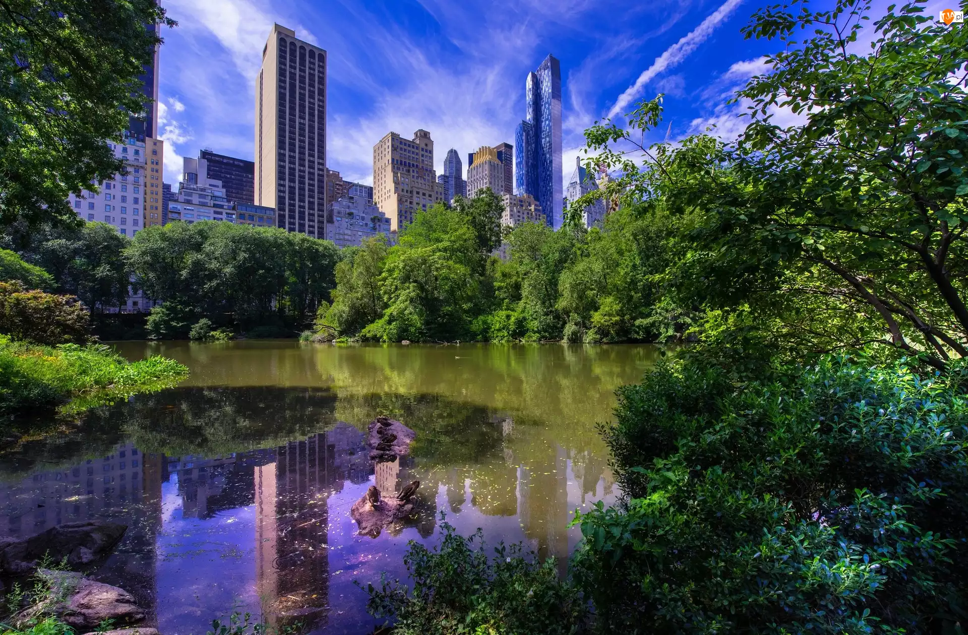 Nowy Jork, Dzielnica Manhattan, Drzewa, Stany Zjednoczone, Drapacze chmur, Staw, Park miejski Central Park