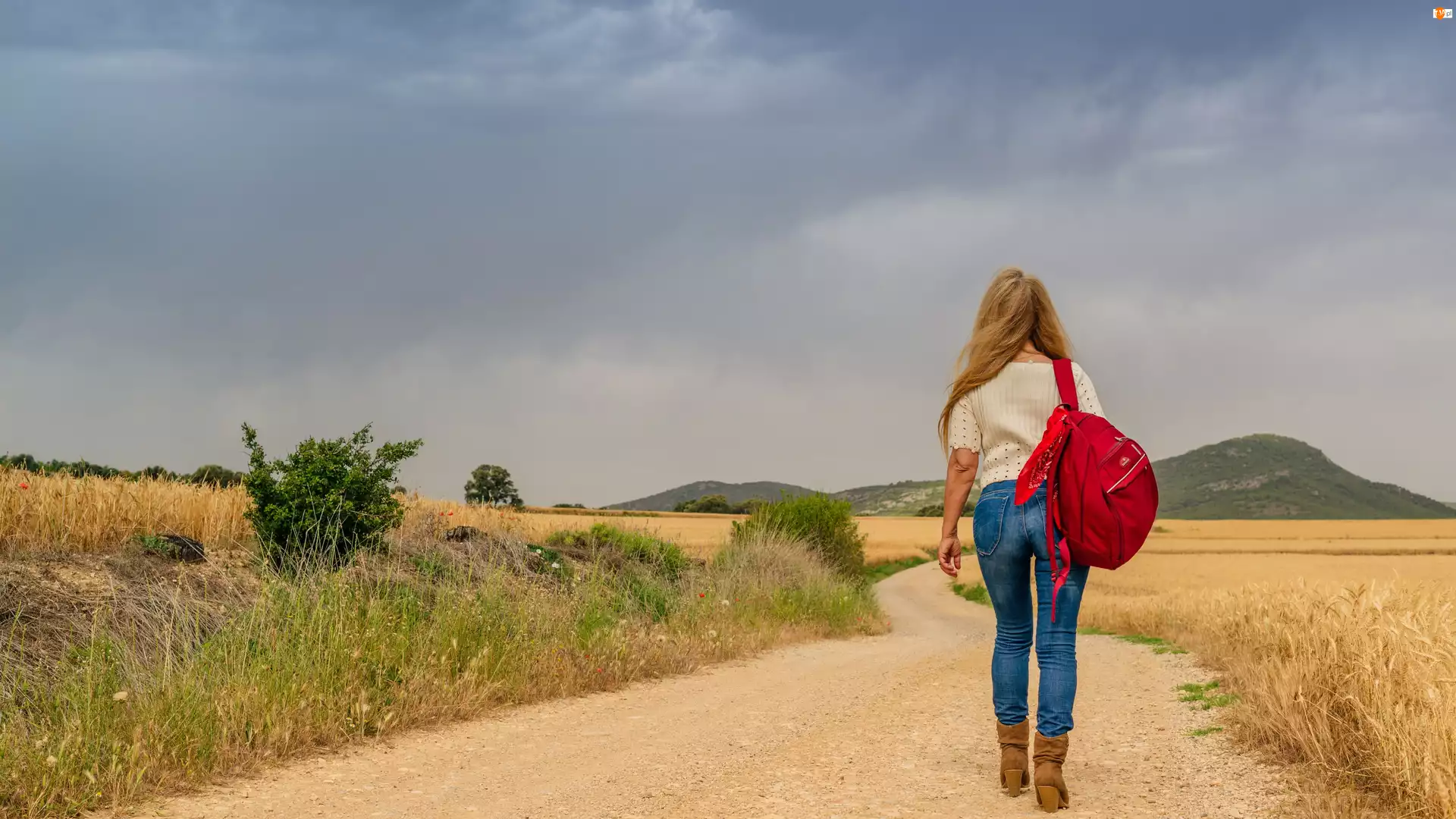Dziewczyna, Droga, Pola, Góry, Plecak, Drzewa