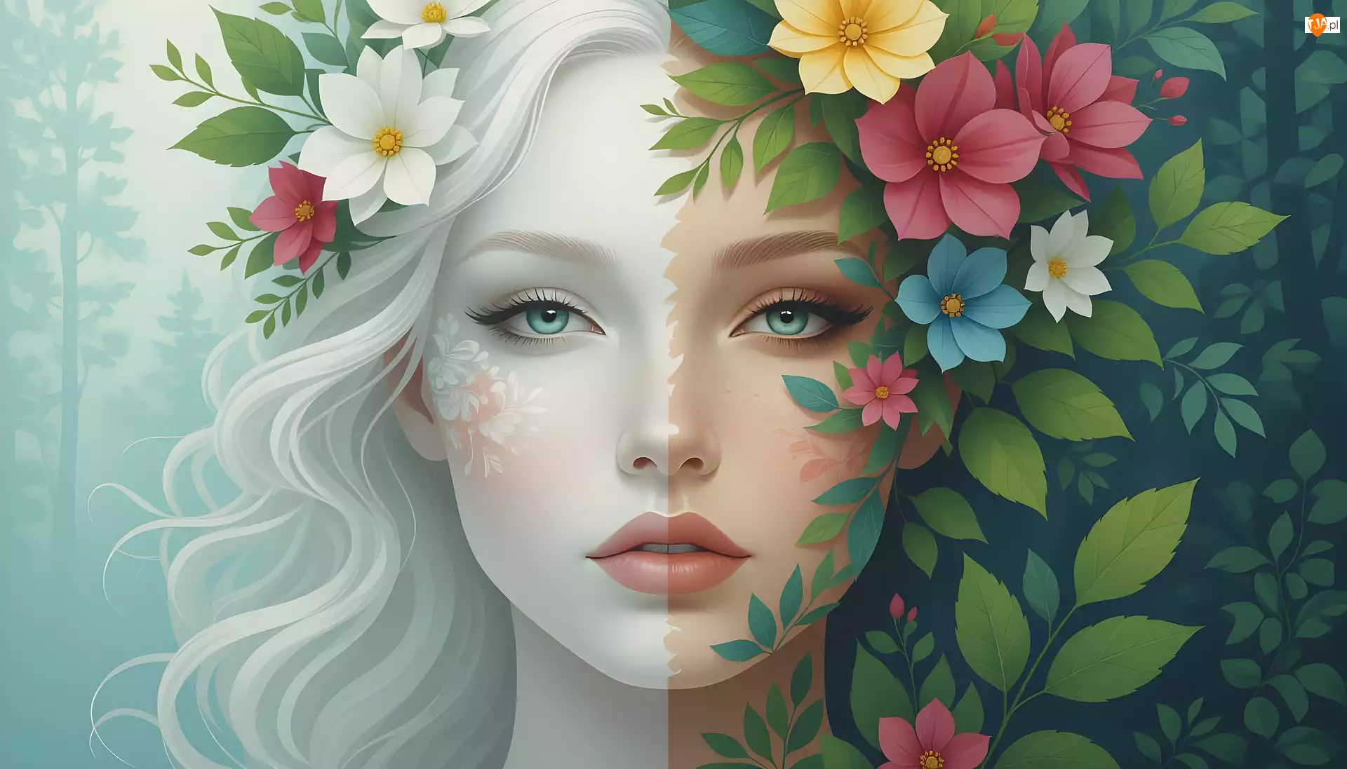 Grafika, Dziewczyna, Twarz, Kwiaty