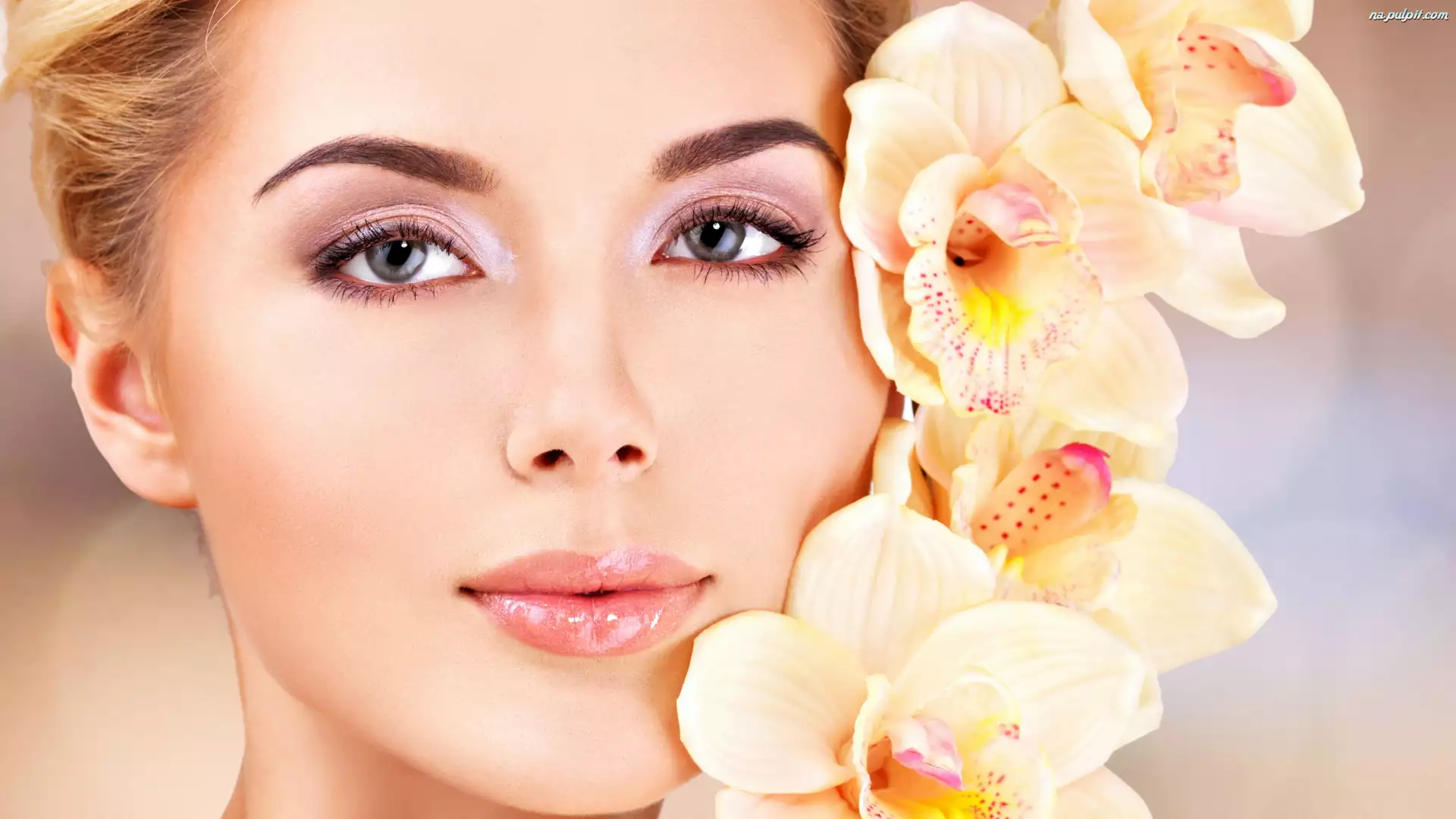 Makijaż, Storczyki, Blondynka, Kobieta, Kwiaty