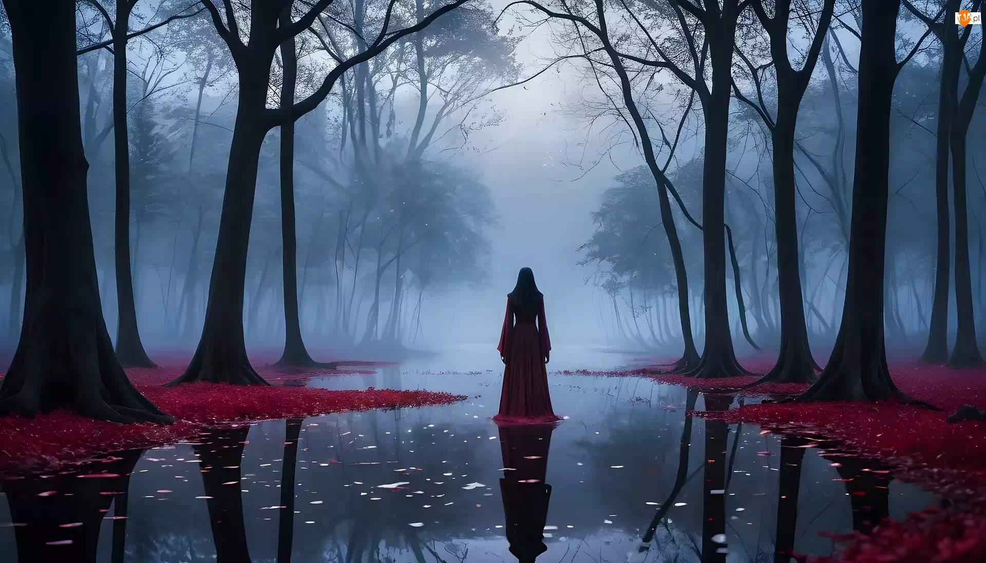 Dziewczyna, Krajobraz, Odbicie, Woda, Grafika, Droga, Las, Drzewa, Cień, Aleja, Komputerowa, Mgła, Liście