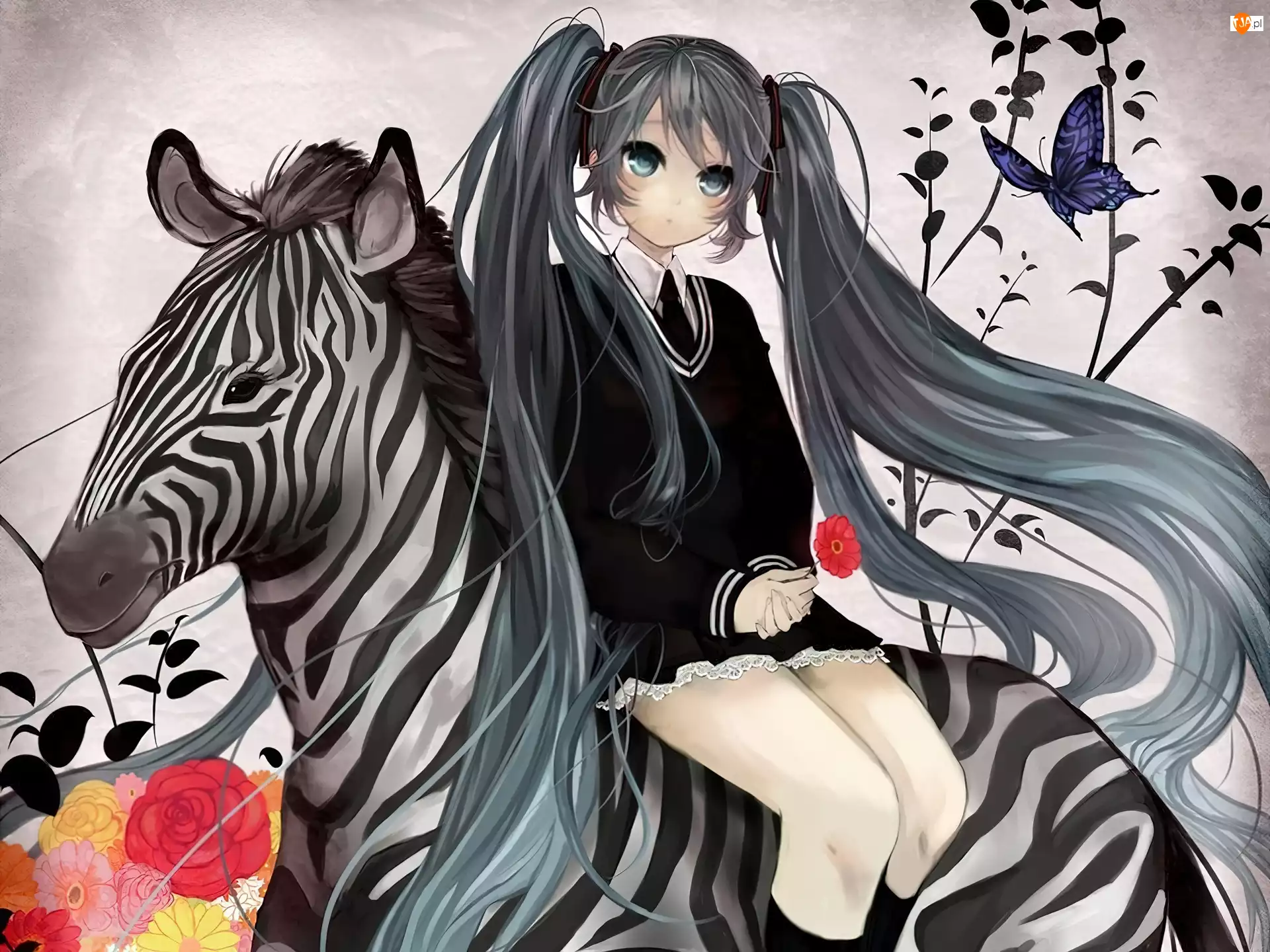 Dziewczyna, Kwiaty, Motyl, Zebra