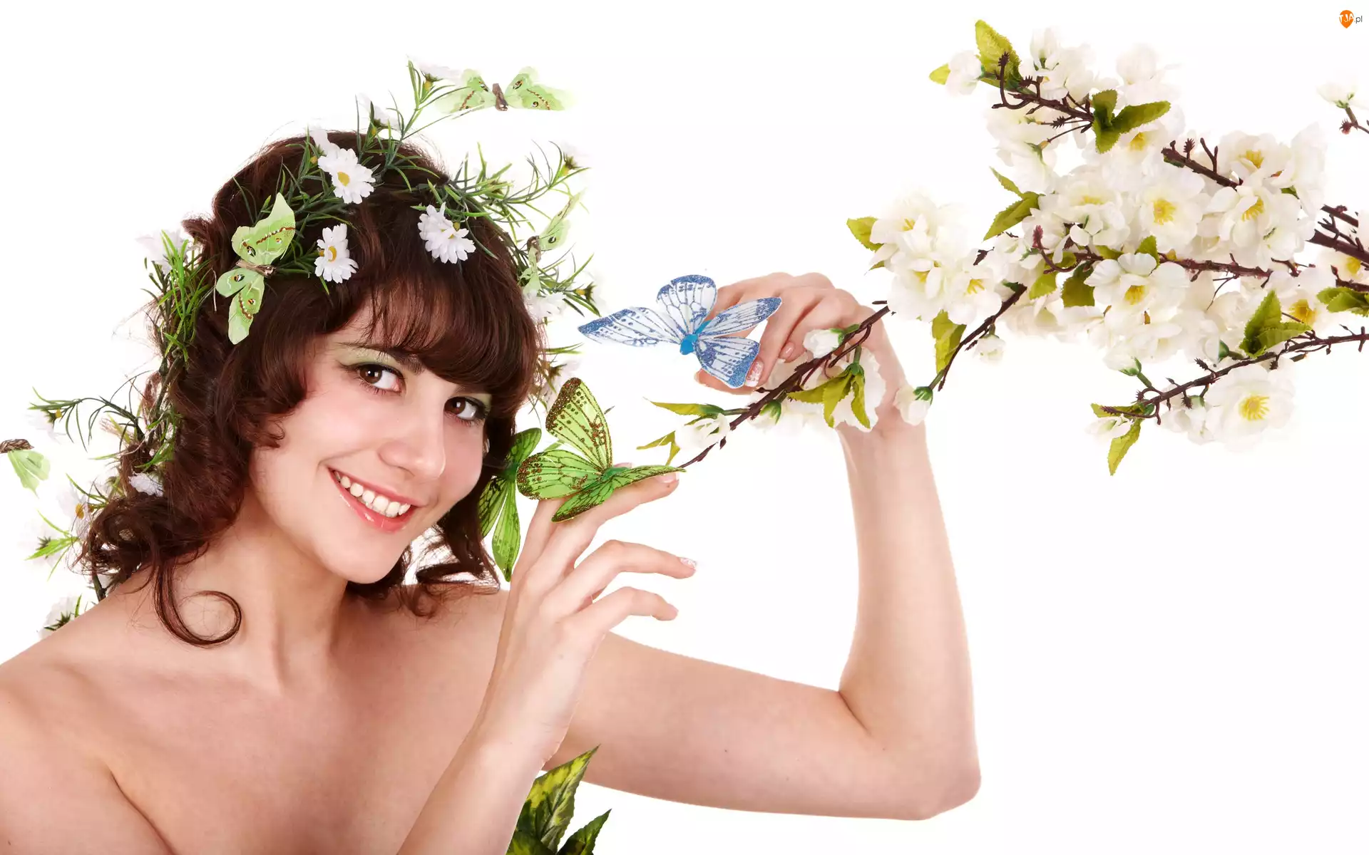 Dziewczyna, Motyle, Makijaż, Kwiaty