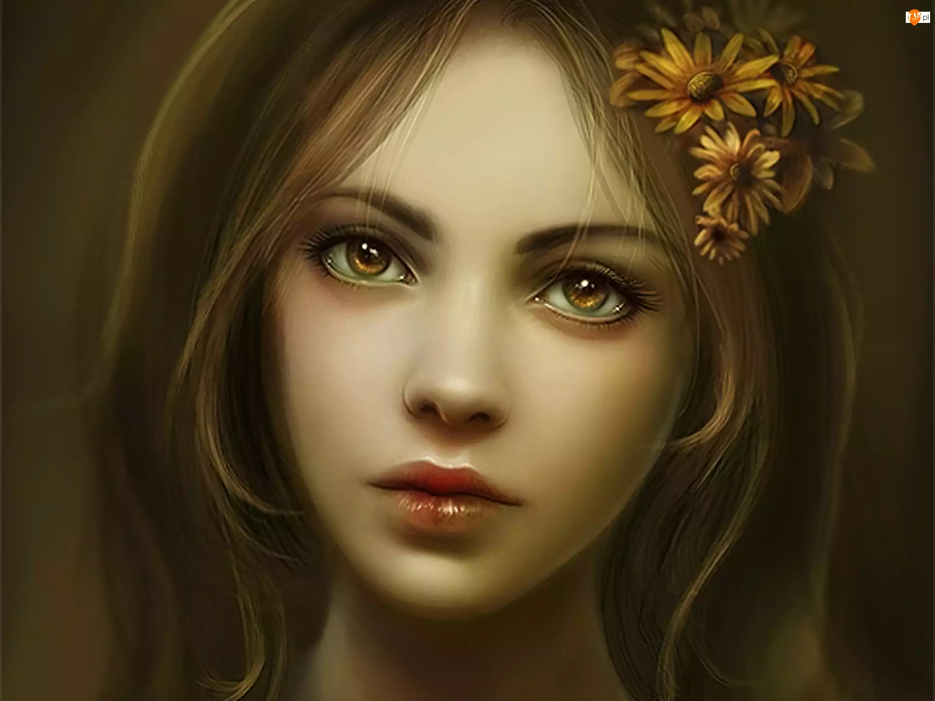 Dziewczyna, Oczy, Kwiaty, Brązowe