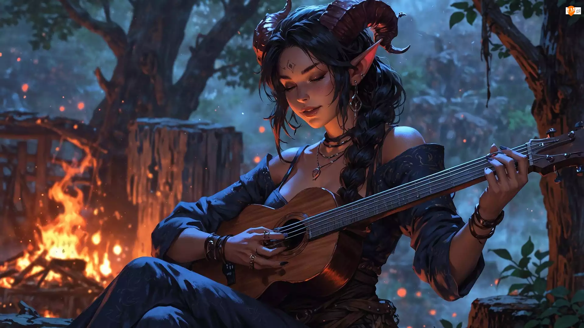 Dziewczyna, Ognisko, Elfica, Grafika, Gitara