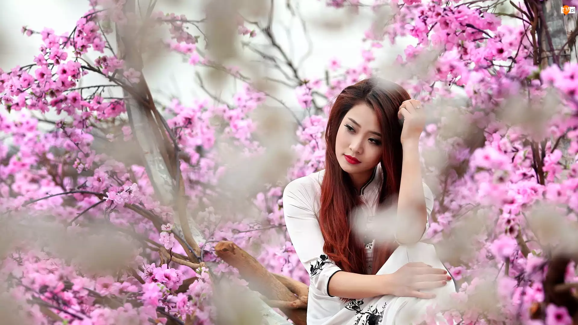 Kobieta, Kwiaty, Azjatka, Drzewo