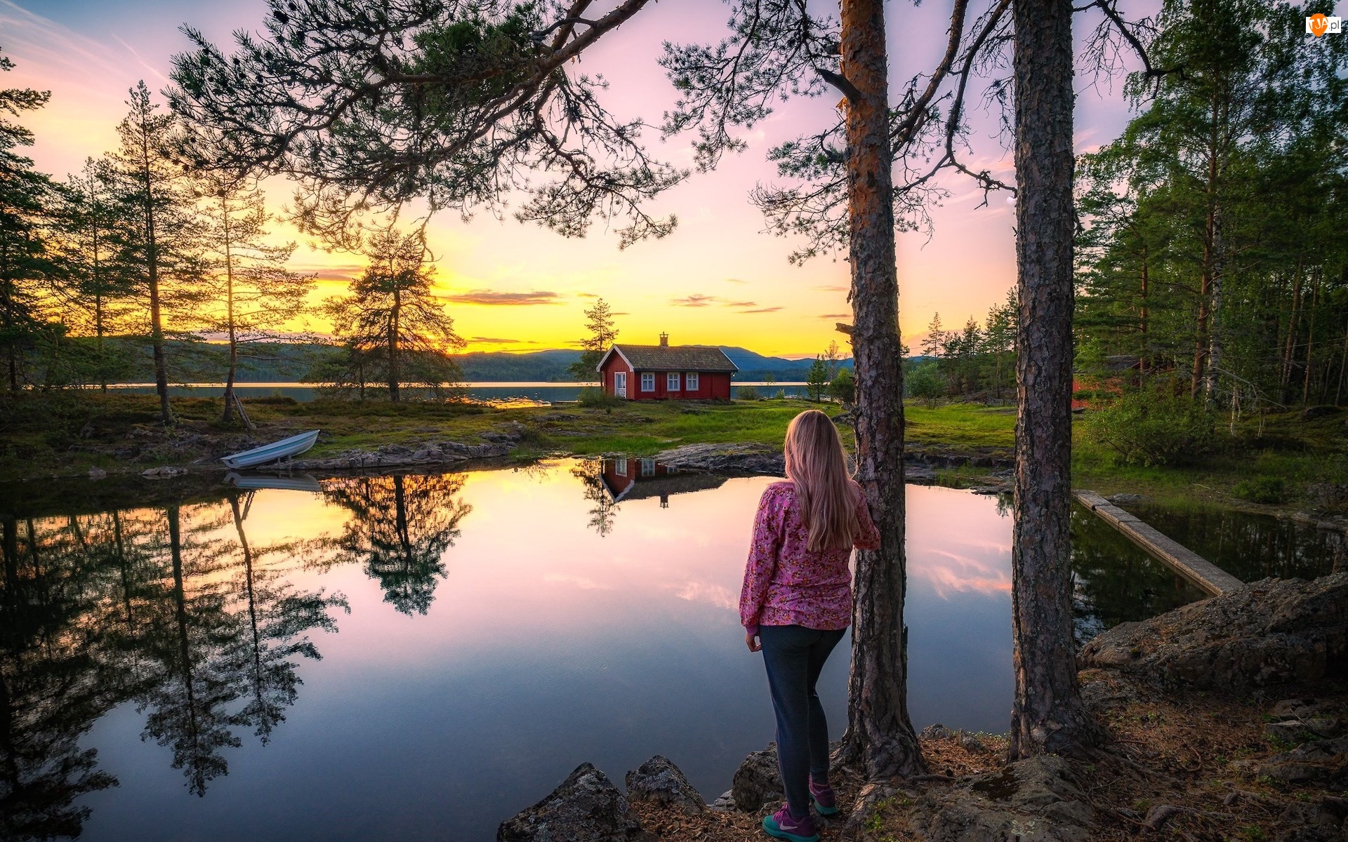 Tyristrand, Jezioro, Kobieta, Norwegia, Drzewa, Dom, Valeren