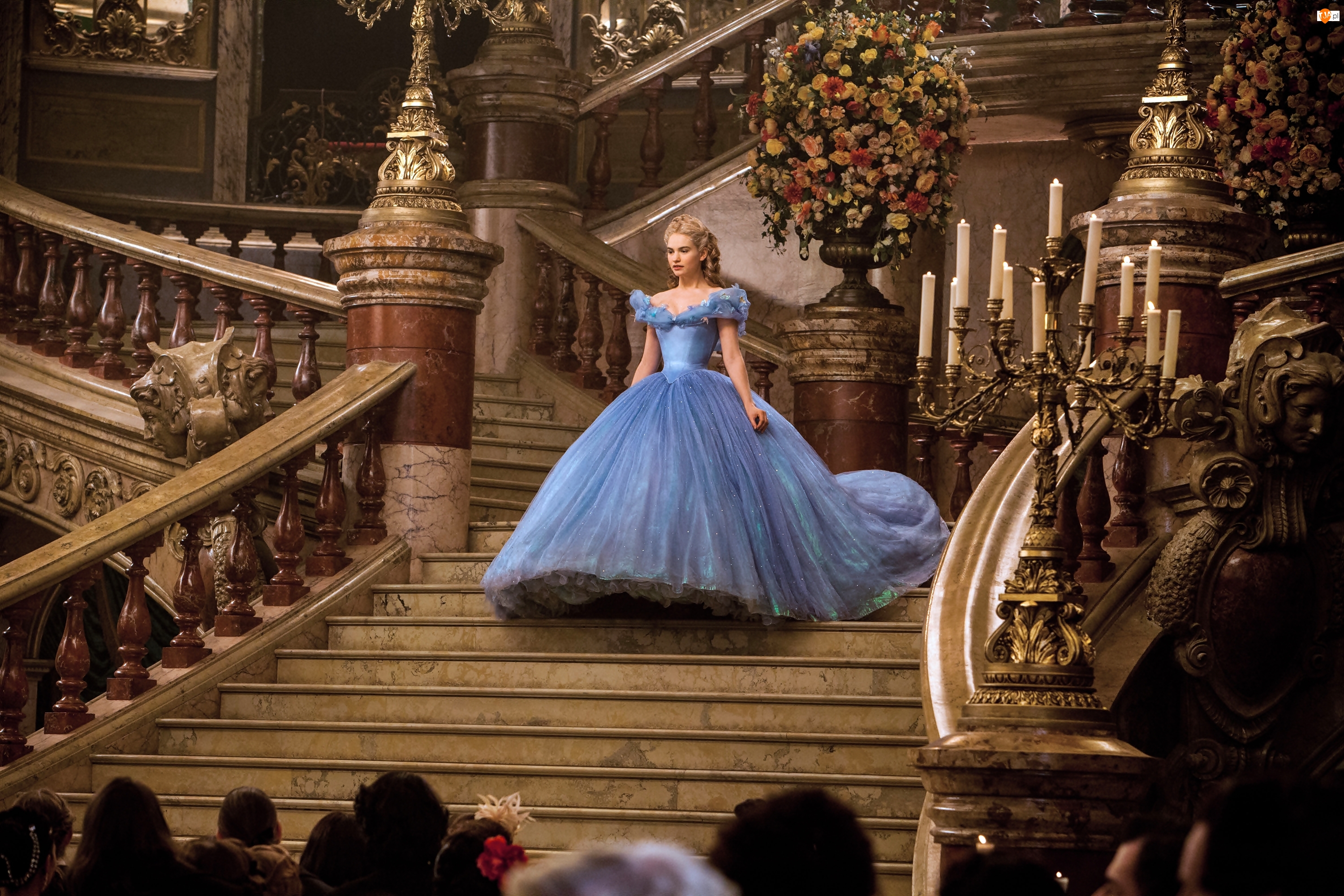 Lily James, Niebieska, Aktorka, Kopciuszek, Cinderella, Suknia, Schody, Dziewczyna, Film