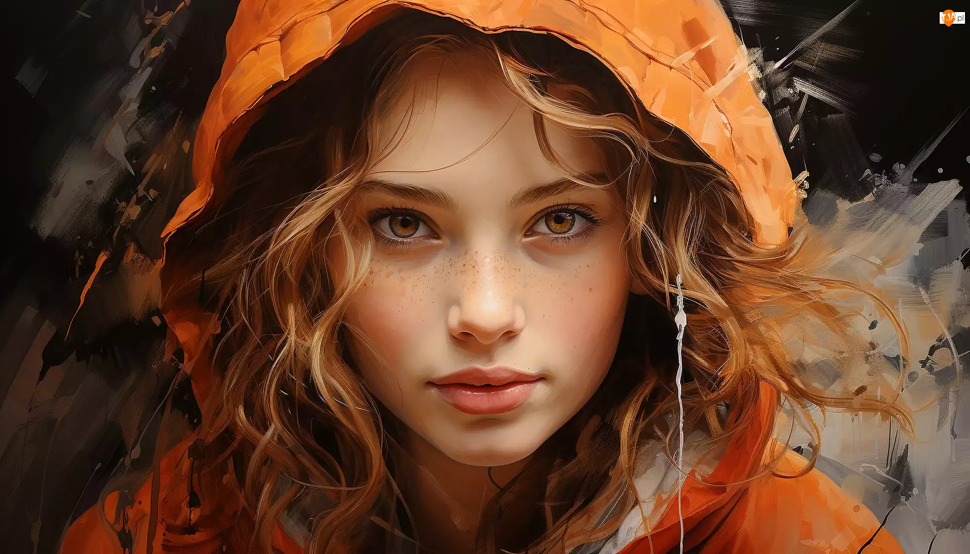 Spojrzenie, Dziewczyna, Pomarańczowy, Grafika, Piegi, Kaptur
