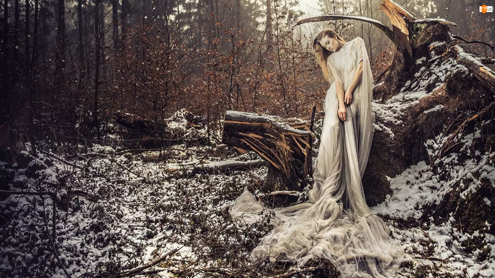 Śnieg, Długa, Pień, Dziewczyna, Zwalony, Las, Suknia