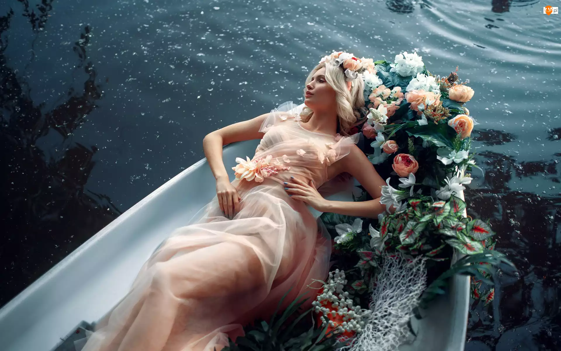 Suknia, Kwiaty, Blondynka, Kobieta, Łódka