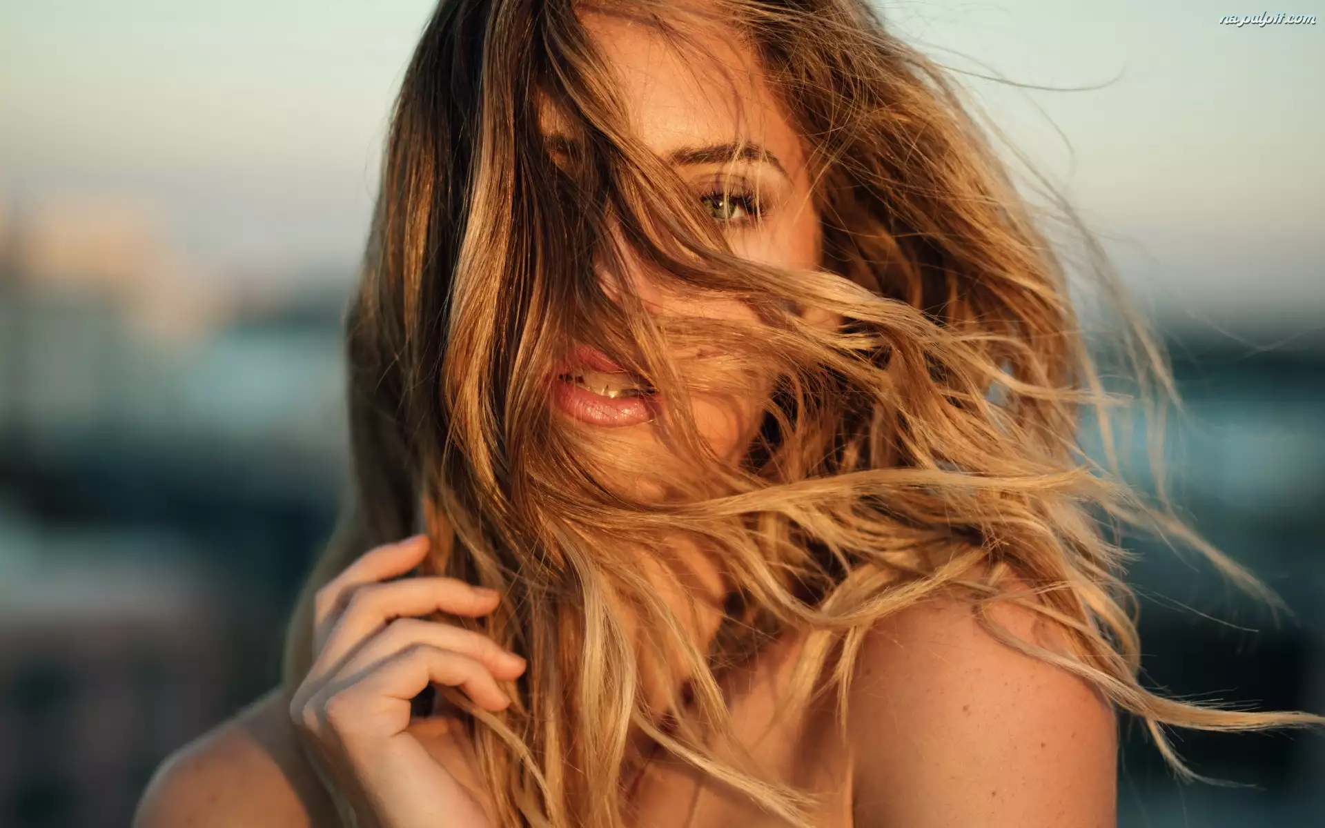 Dziewczyna z rozwianymi włosami padającymi na tw
