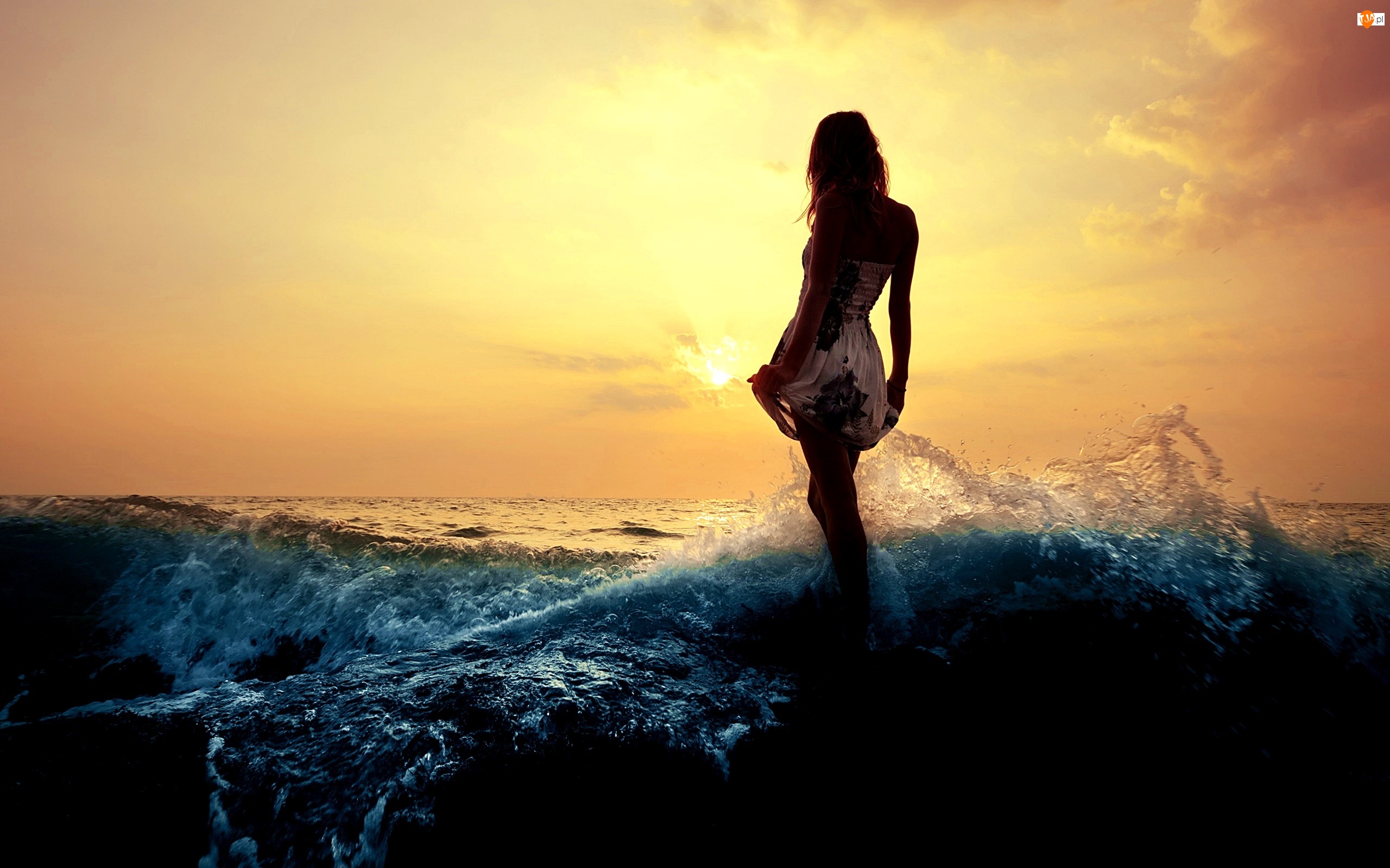 Dziewczyna, Zachód Słońca, Morze, Fale