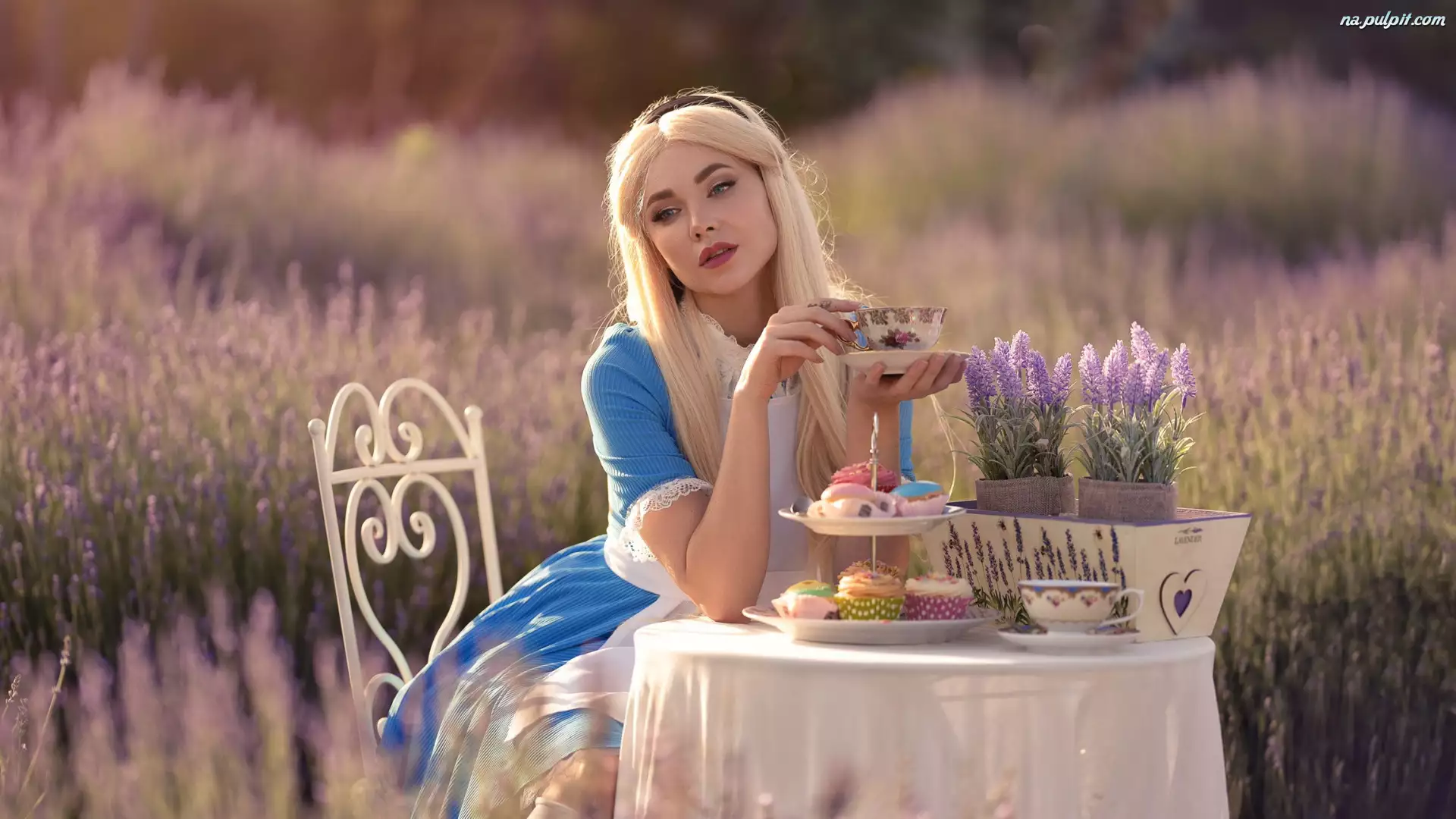 Blondynka, Stolik, Filiżanka, Dziewczyna, Kwiaty, Ciastka, Obrus