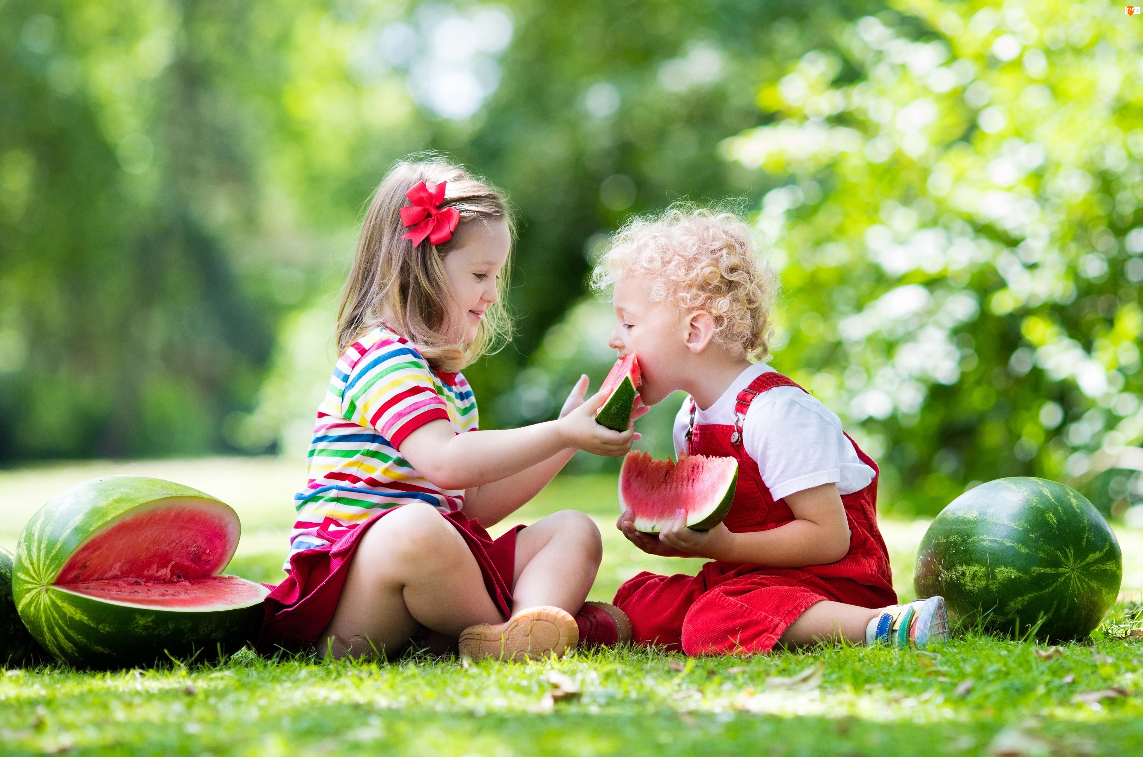 Dziewczynka częstująca chłopczyka arbuzem