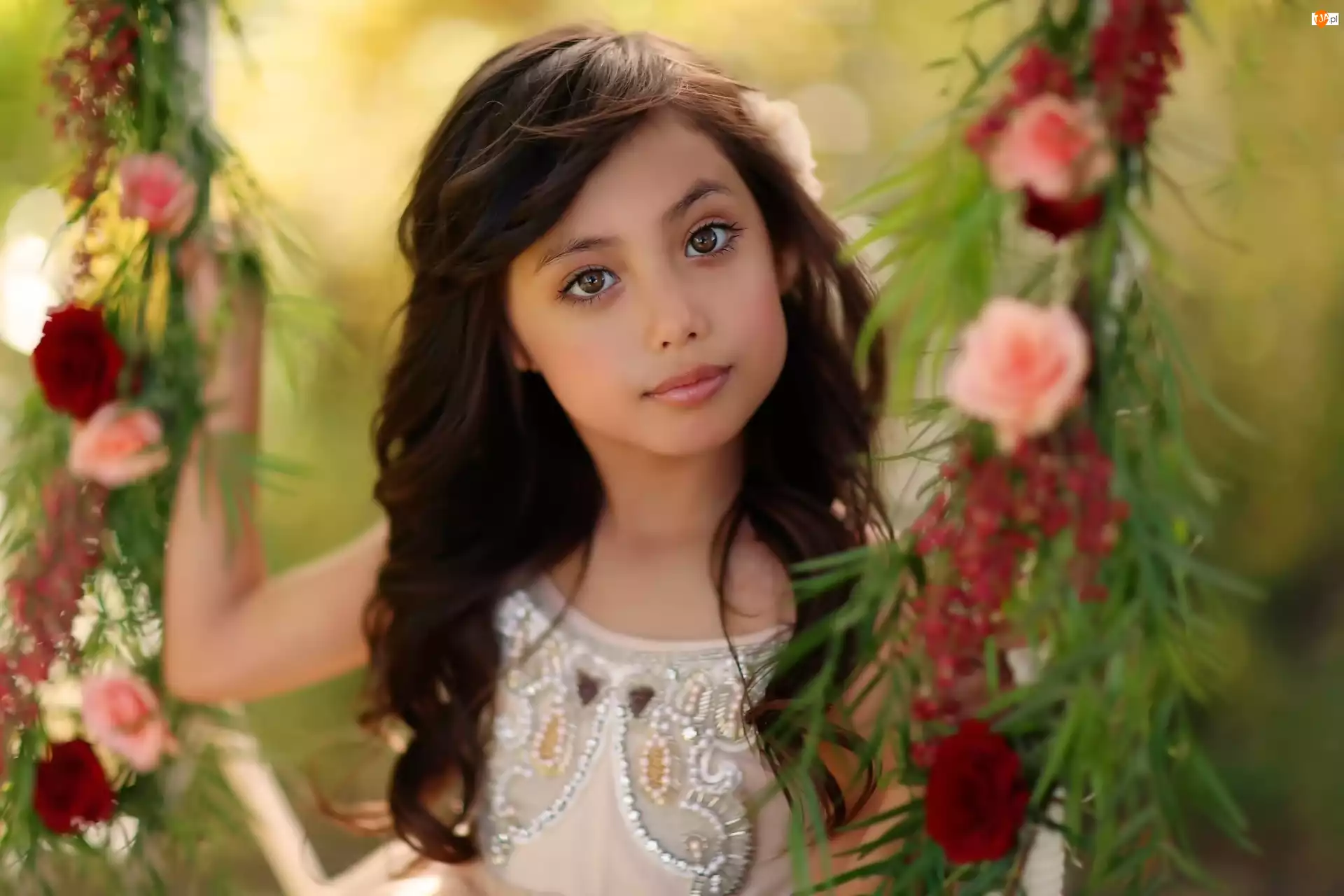 Dziewczynka na huśtawce z kwiatów