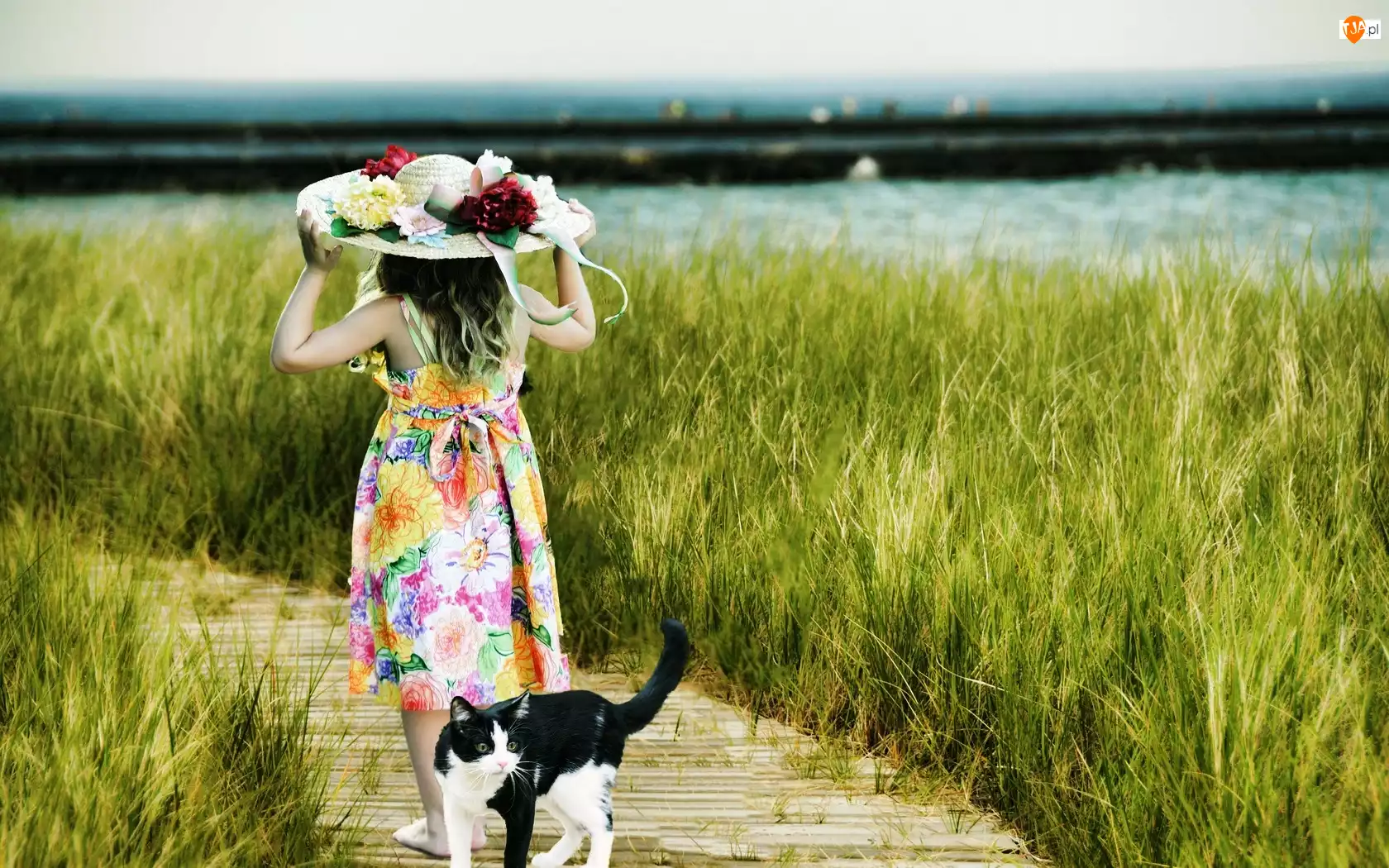 Dziewczynka, Trawa, Kapelusz, Kotek