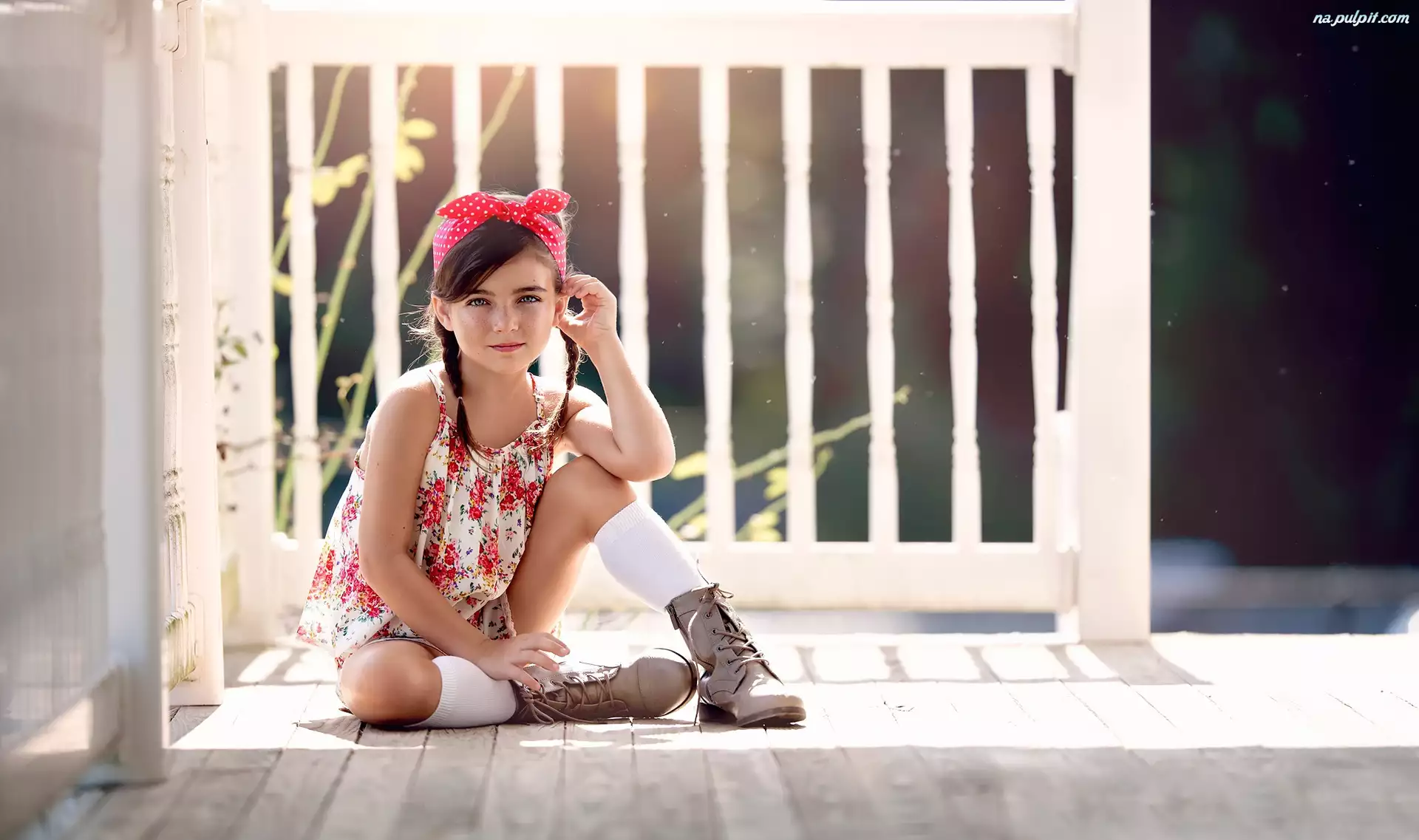Dziewczynka w warkoczykach i opaską siedząca na