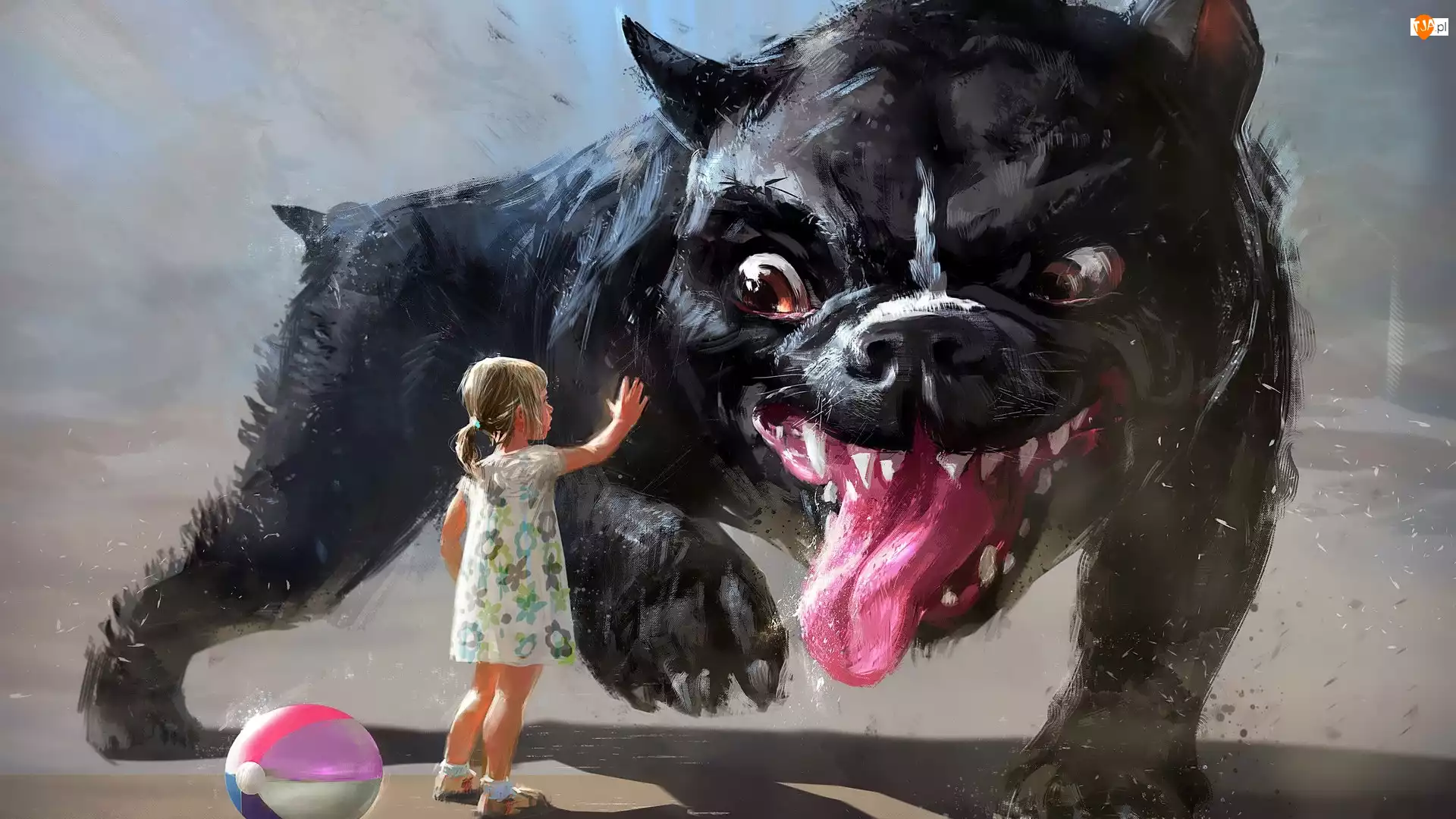 Dziewczynka, Dziecko, Pies, Digital Art, Zły, Piłka