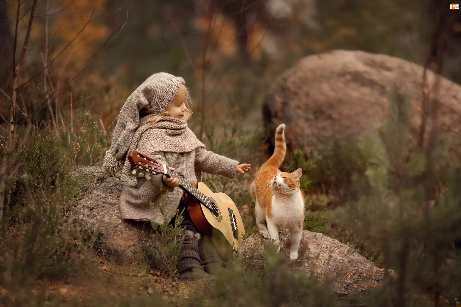 Kamienie, Jesień, Gitara, Dziewczynka, Kot