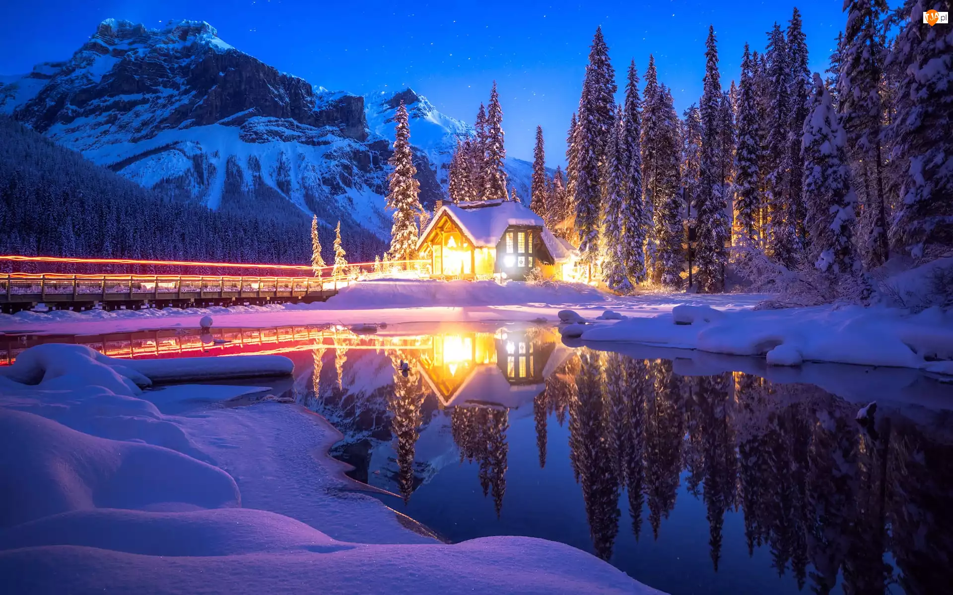 Emerald Lake, Oświetlony, Drzewa, Góry, Park Narodowy Yoho, Prowincja Kolumbia Brytyjska, Dom, Zima, Las, Jezioro, Kanada