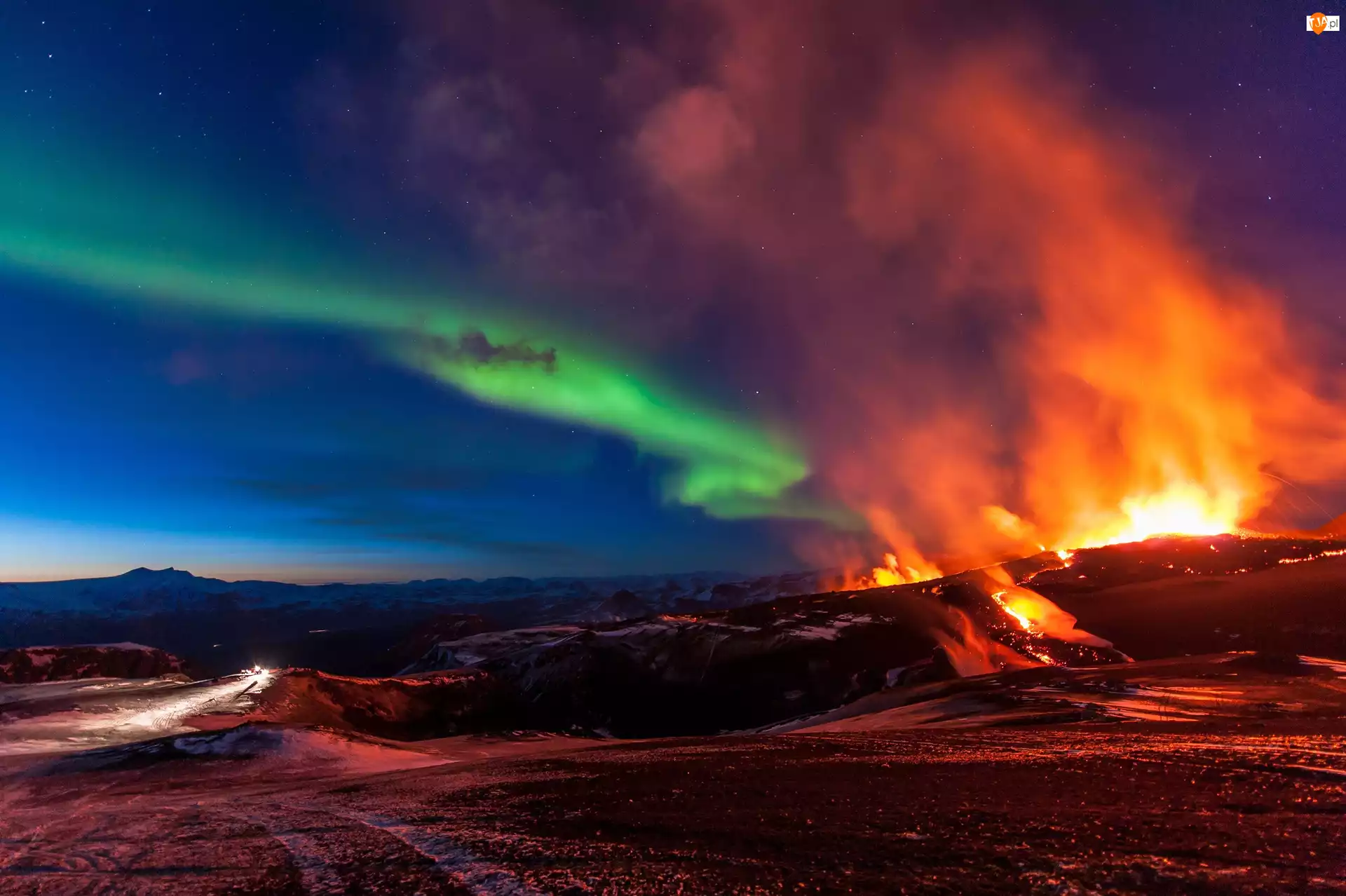 Erupcja, Zorza, Islandia, Polarna, Góry, Wulkanu