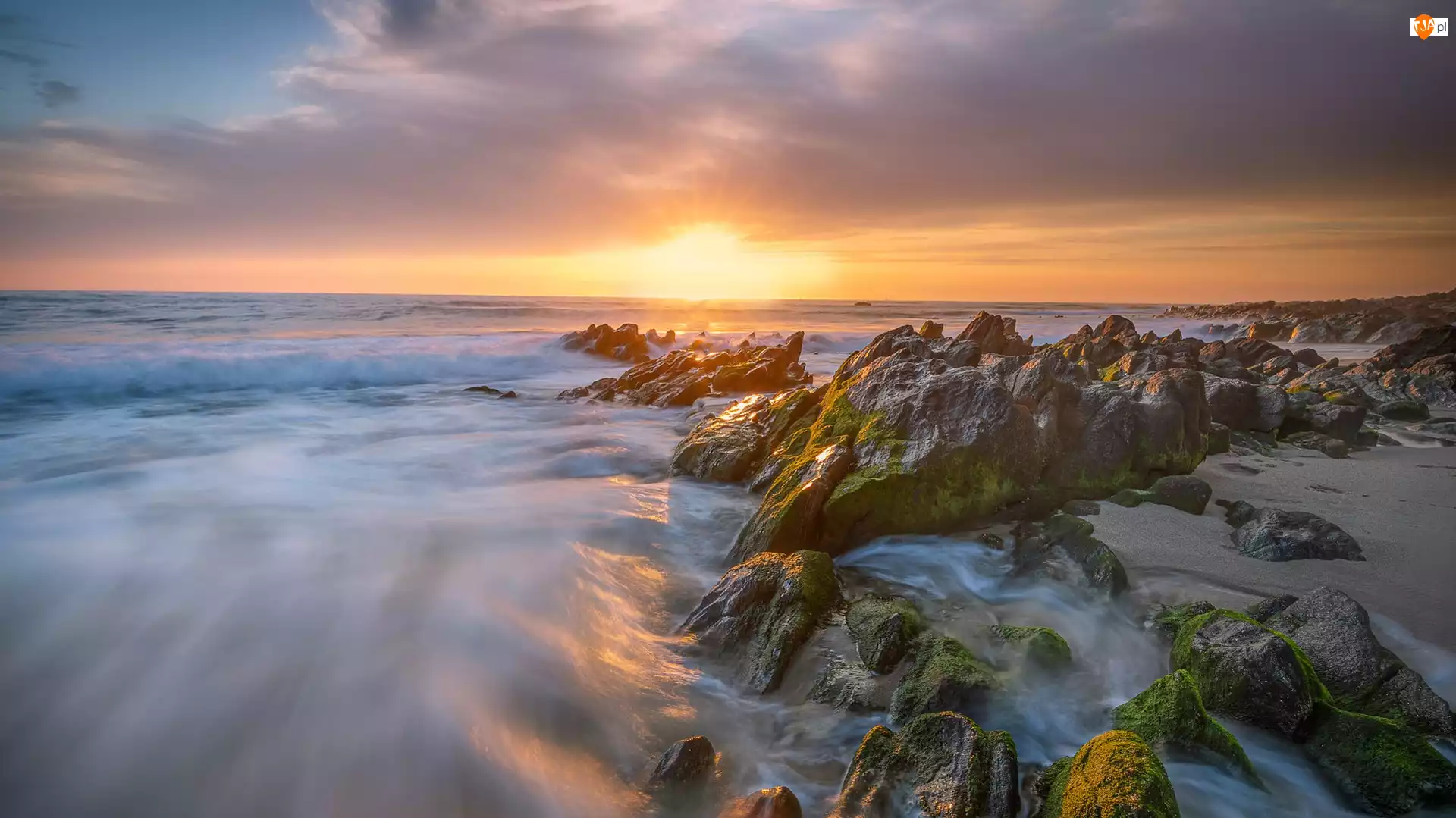 Fale, Morze, Zachód słońca, Portugalia, Skały, Chmury