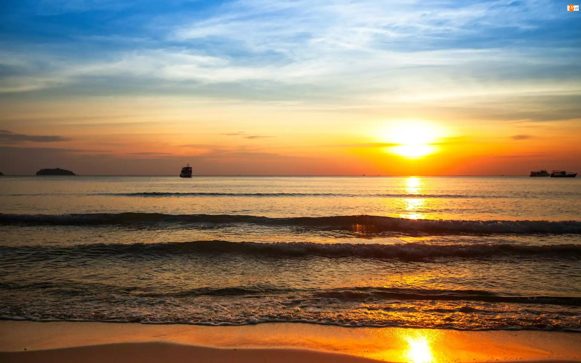 Fale, Zachód, Plaża, Słońca, Morze, Statki
