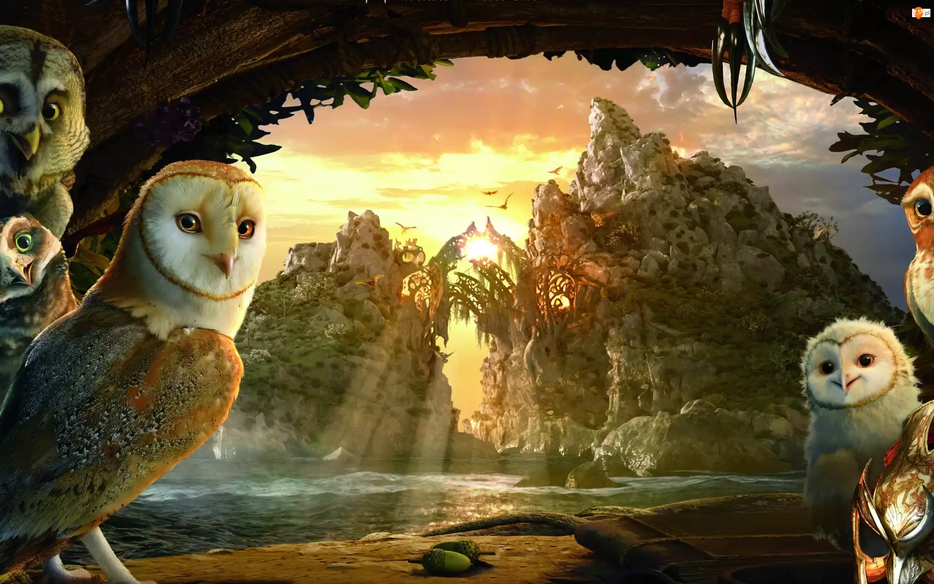 Fantasy, Góry, Słońca, Promienie, Sowy