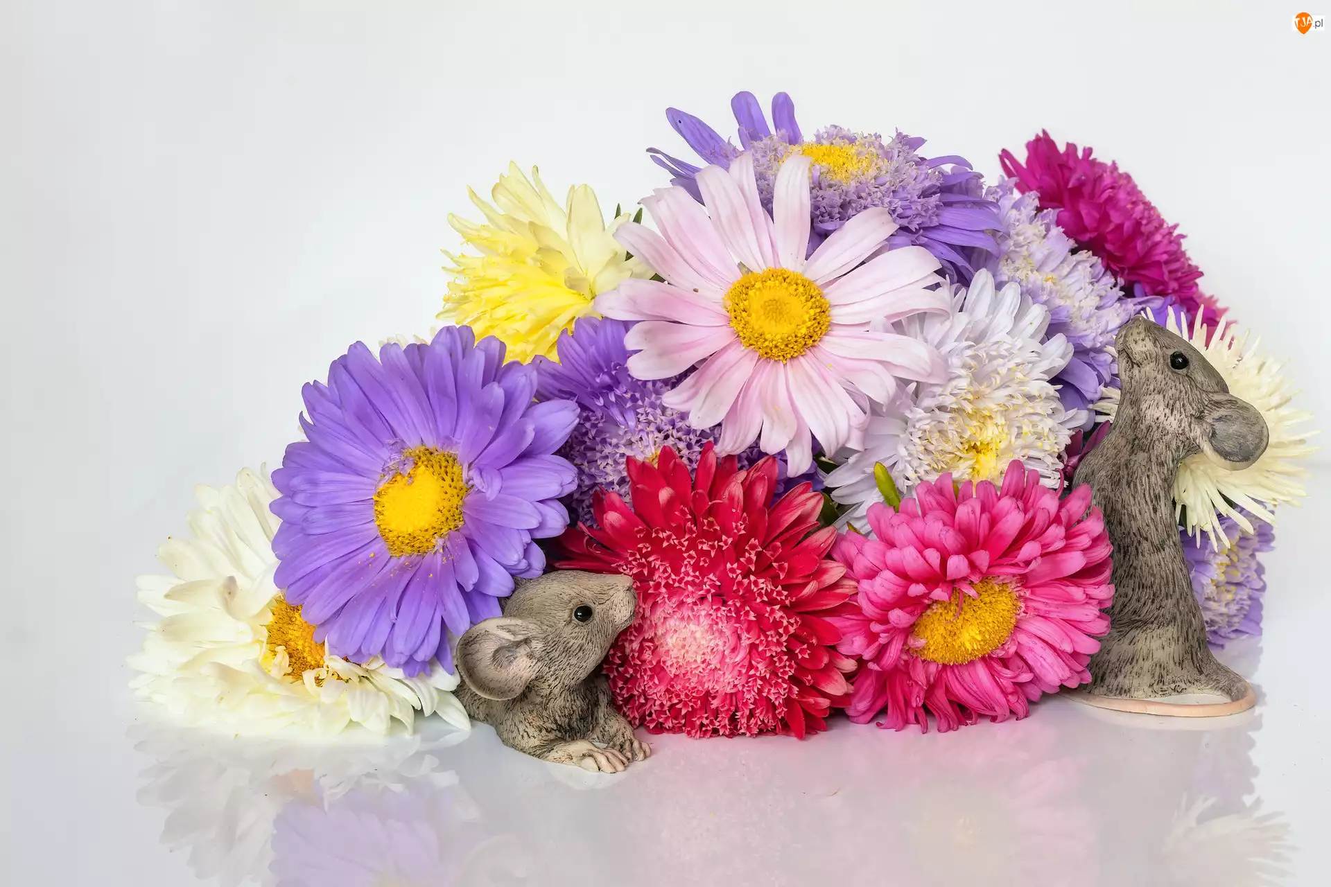 Astry, Myszek, Kwiaty, Kolorowe, Figurki