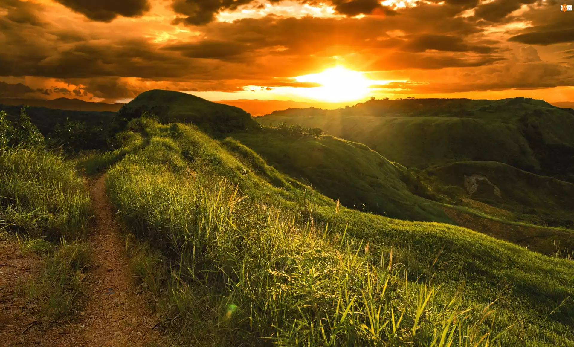 Filipiny, Pole, Ścieżka, Zachód słońca, Chmury