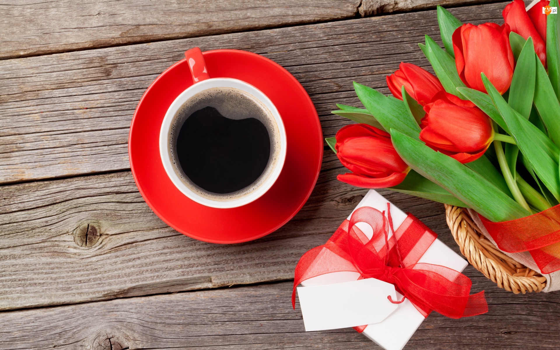 Prezent, Filiżanka, Koszyk, Talerzyk, Tulipany, Deski, Kawa, Kwiaty, Kokarda, Czerwone, Kartka