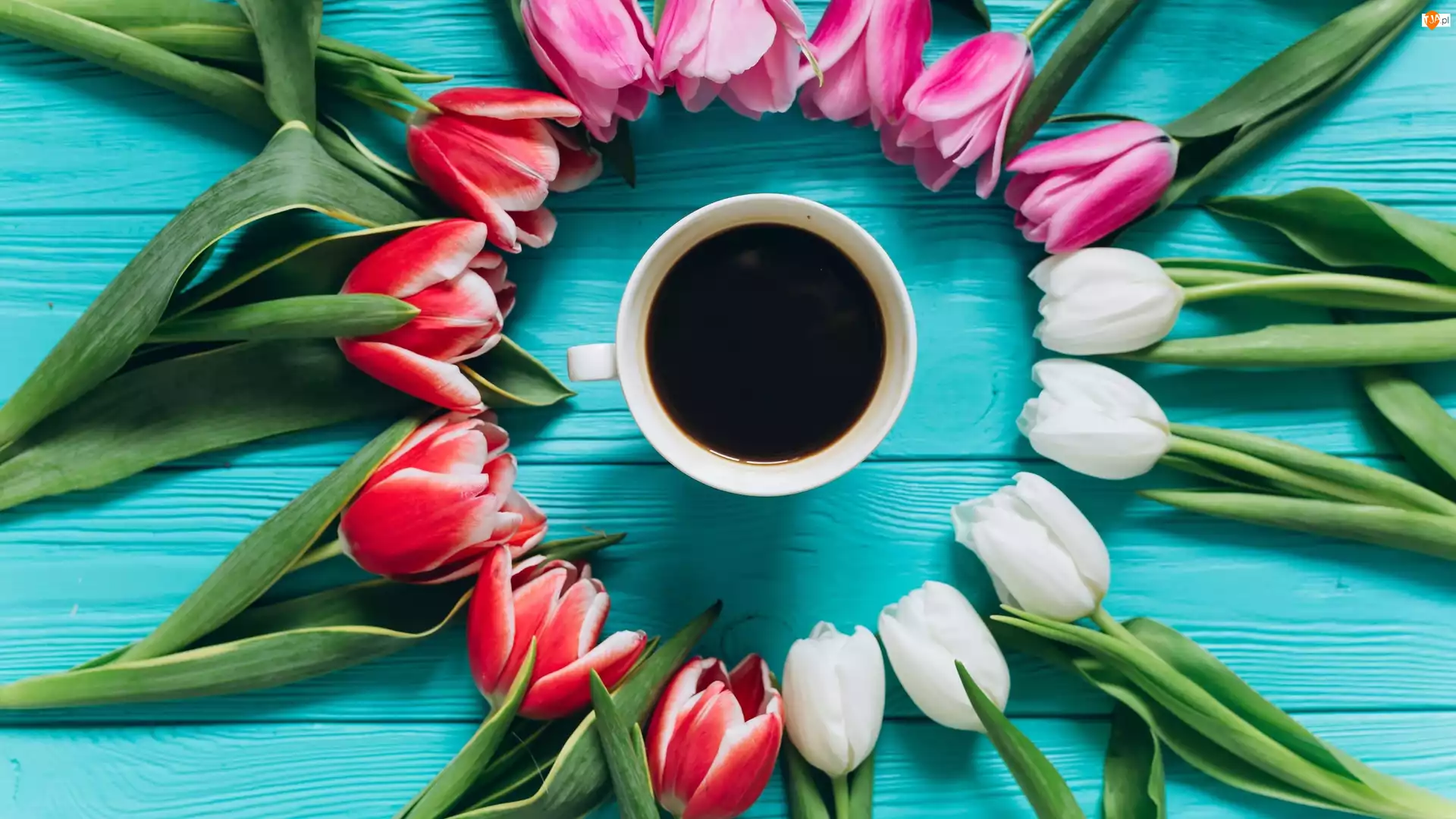 Kawa, Deski, Tulipany, Kolorowe, Filiżanka