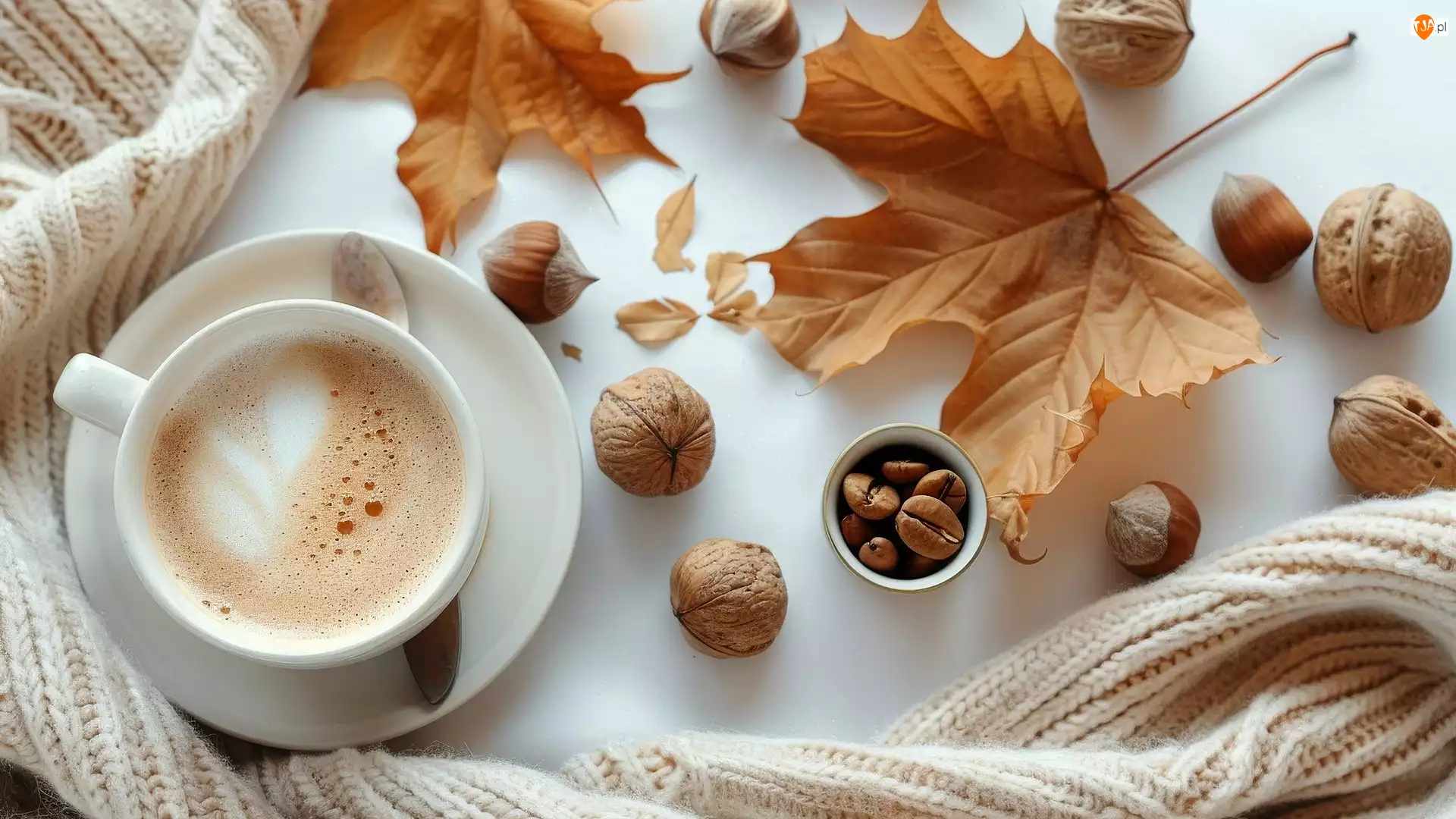 Filiżanka, Talerzyk, Liście, Kawa, Brązowe, Orzechy, Szal