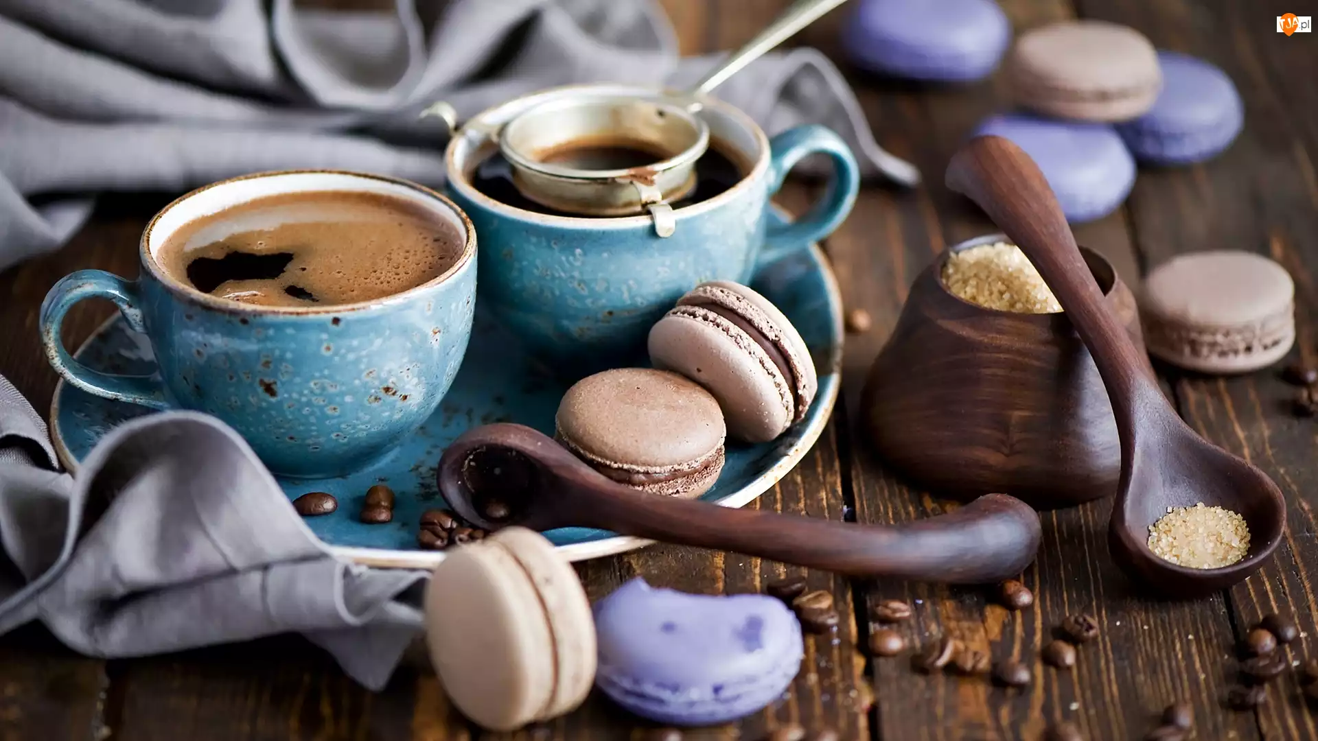 Ziarna, Filiżanki, Cukier, Sitko, Łyżki, Talerzyk, Ciasteczka, Kawa, Makaroniki