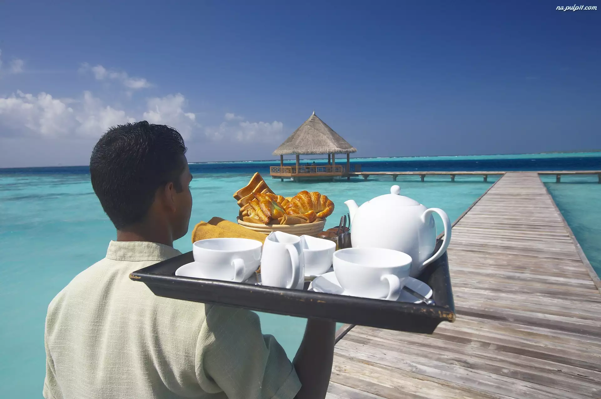 Filiżanki, Morze, Mężczyzna, Molo, Taca